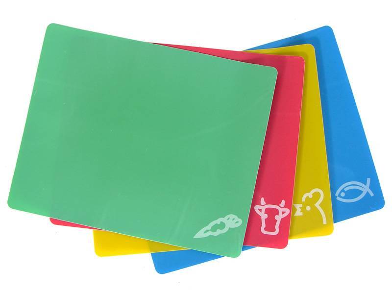 Этот набор из 4-х гибких разделочных досок создан для тех, кто заботится о чистоте и безопасности на кухне. Каждая доска имеет свой цвет и предназначена для определённого типа продуктов: зелёная — для овощей, красная — для мяса, жёлтая — для птицы, синяя — для рыбы.