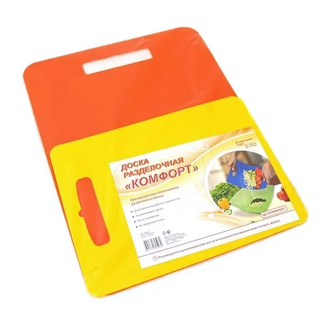 Разделочная доска "Комфорт" — это удобное и безопасное решение для ежедневной работы на кухне. Изготовленная из качественного пластика, она сочетает в себе функциональность, долговечность и простоту в уходе. Идеально подходит для нарезки овощей, фруктов, сыра, хлеба и других продуктов.