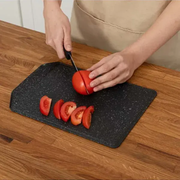 Доска изготовлена из безопасного пластика, который не тупит ножи во время резки, что позволяет вам наслаждаться процессом готовки без лишних хлопот. Матовая и нескользящая поверхность обеспечивает надежное сцепление с рабочей поверхностью, а специальный желобок по периметру доски собирает лишний сок, что делает процесс нарезки более чистым и аккуратным.