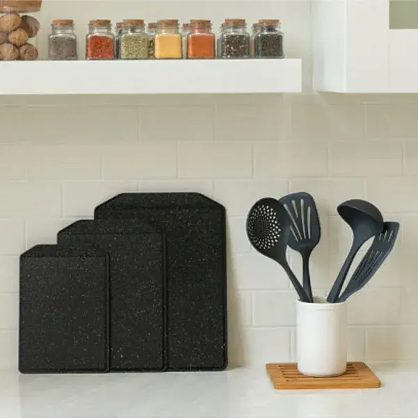 Размеры доски составляют 25х17,6 см, что делает ее компактной и удобной для хранения. Черный цвет с текстурой, напоминающей гранит, придаст вашей кухне стильный вид. Доска подходит для нарезки овощей, фруктов и других продуктов, что делает ее универсальным инструментом для любой кухни.