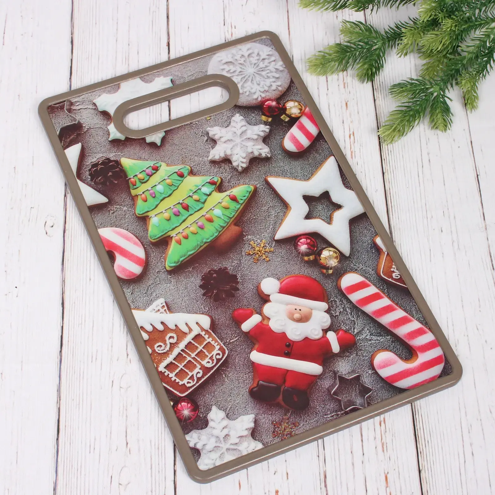 Элегантное сочетание функциональности и новогоднего настроения для вашей кухни. Яркий дизайн с имбирными пряниками, снежинками и фигуркой Санта-Клауса превратит обычную нарезку продуктов в праздничный ритуал.