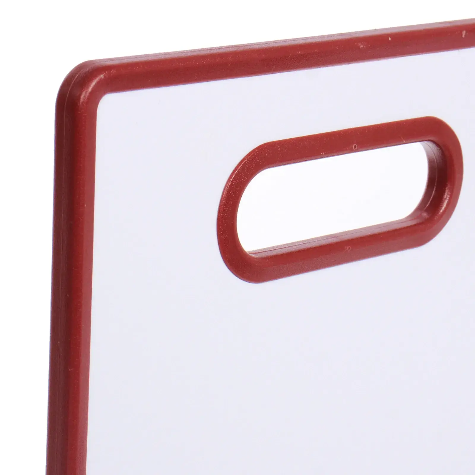 Изделие изготовлено из безопасного пищевого пластика, устойчивого к высоким температурам. Закруглённые углы и прорезиненная окантовка предотвращают скольжение на поверхности. Двусторонний дизайн позволяет использовать доску как декоративный элемент даже после приготовления.