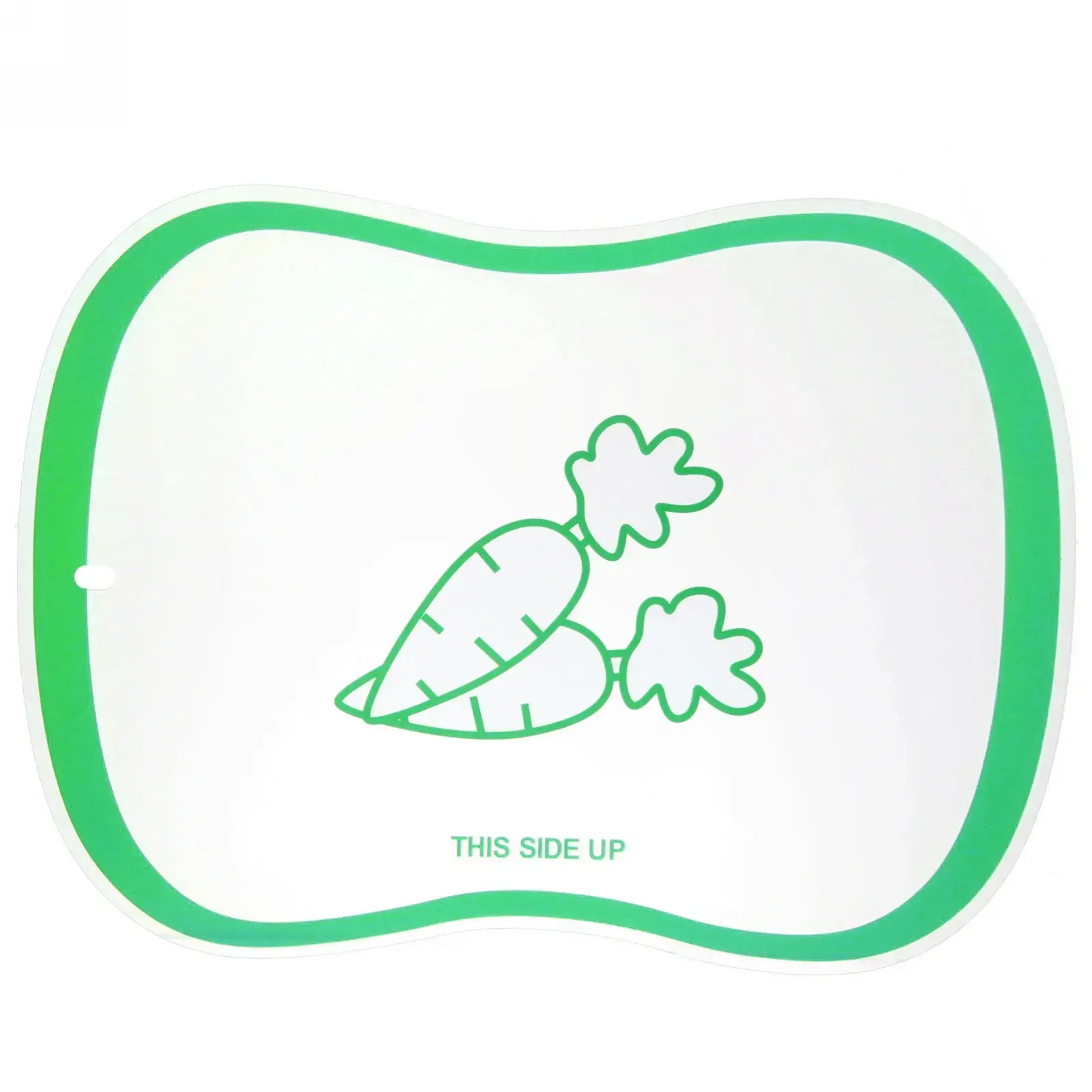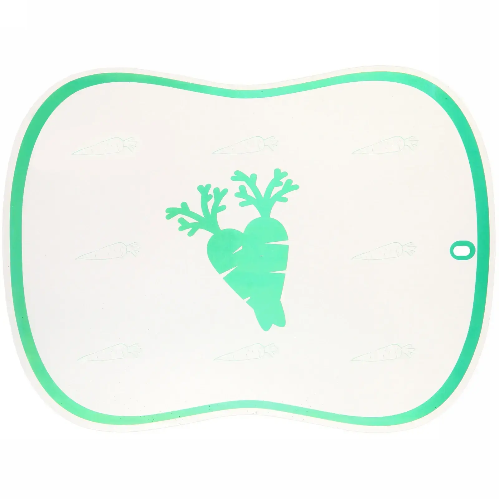 Доска имеет гладкую поверхность, что предотвращает прилипание продуктов во время нарезки. Зеленая окантовка по периметру добавляет стильный акцент и помогает удерживать продукты на месте. Удобный круглый вырез с одной стороны позволяет легко захватывать доску, что делает ее использование еще более комфортным.