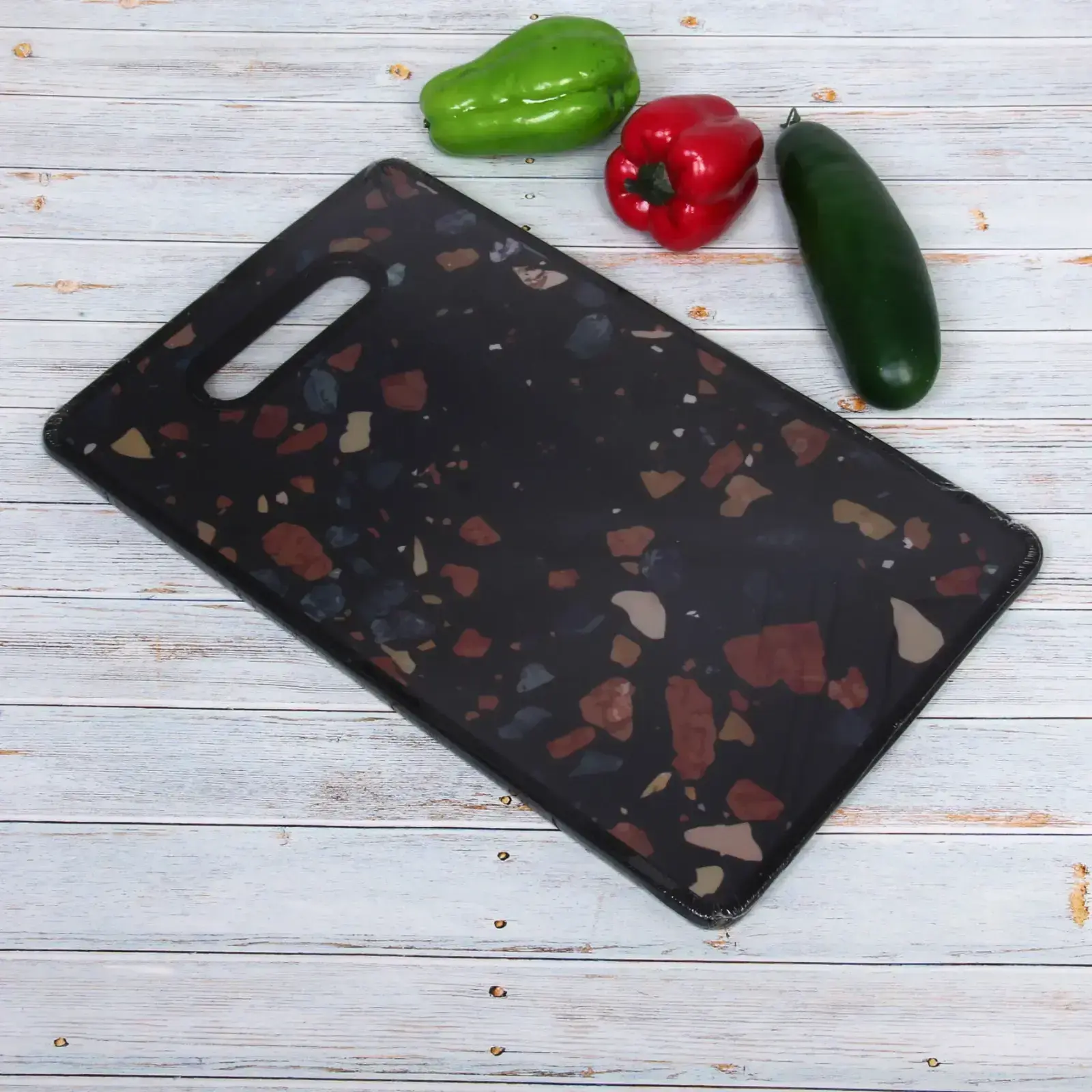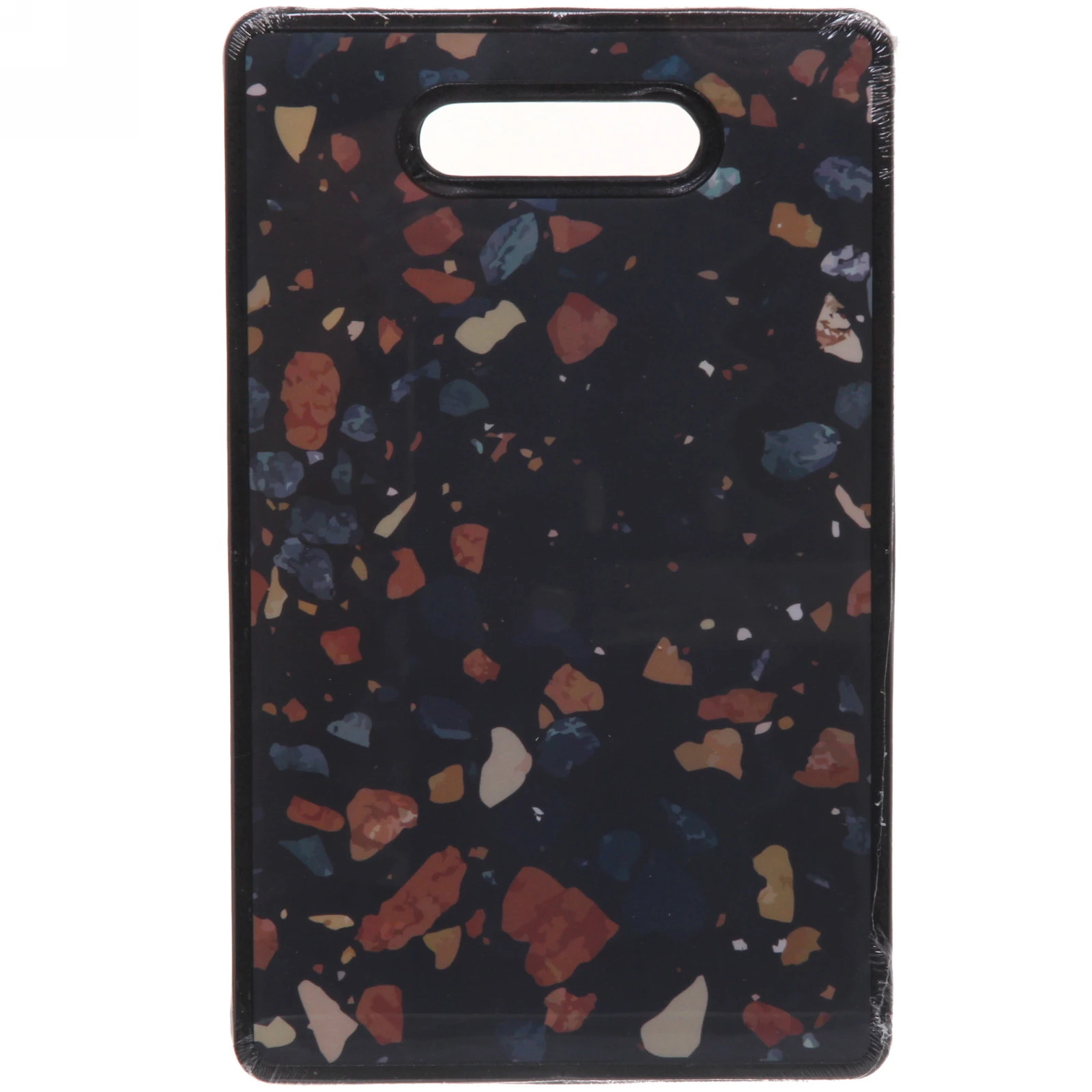 Пластиковая поверхность с антискользящим эффектом предотвращает смещение продуктов. Материал устойчив к воздействию ножей — на доске не остаётся глубоких царапин, где могли бы скапливаться бактерии.