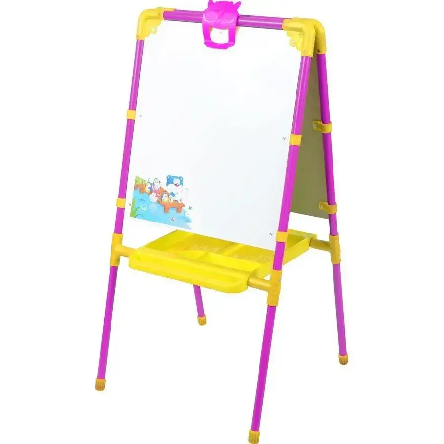 Главное преимущество этого мольберта — его двусторонняя поверхность, одна из которых предназначена для письма и рисования. Светофорный дизайн добавляет игровую и познавательную составляющую, способствуя развитию логики и внимания. Яркий розовый каркас с декоративной фигуркой и жёлтым лотком делает его привлекательным именно для детей, помогая в создании приятной атмосферы для обучения и творчества.