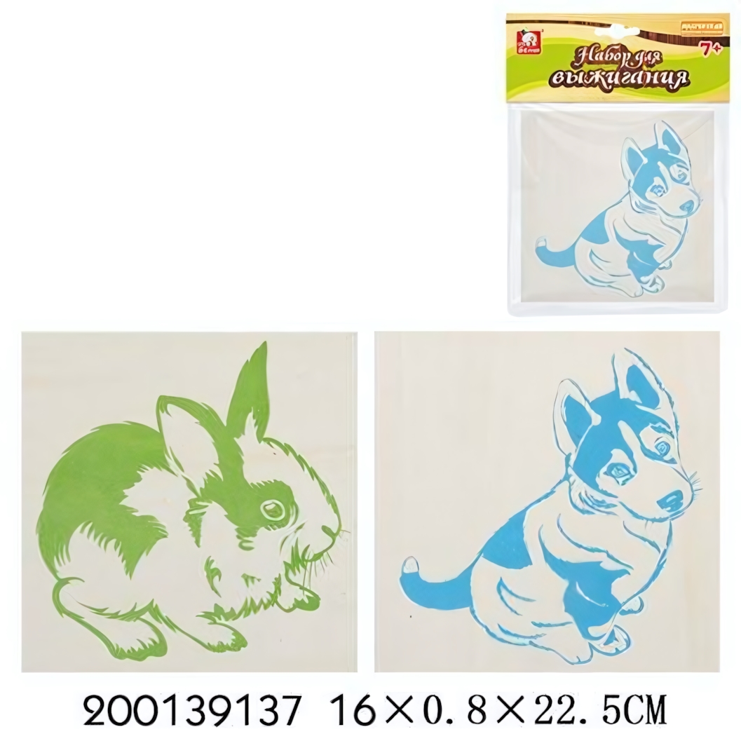 Погрузитесь в увлекательный мир прикладного искусства! Набор для выжигания по дереву — это отличный способ развить у ребенка мелкую моторику, усидчивость и художественный вкус. В комплект входят две качественные заготовки из натуральной фанеры, на которые уже нанесены контуры будущих шедевров: очаровательного щенка и милого кролика. Готовые рисунки делают процесс выжигания понятным и предсказуемым, что особенно важно для начинающих мастеров.