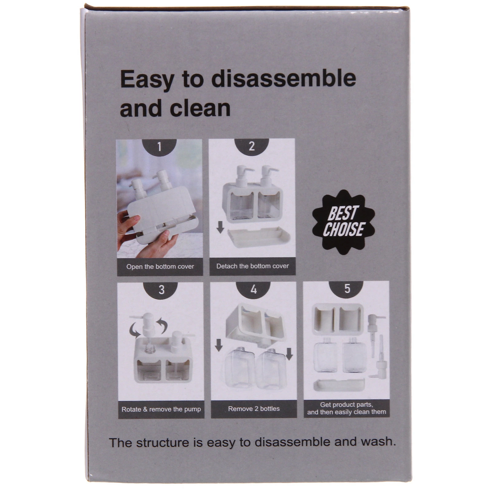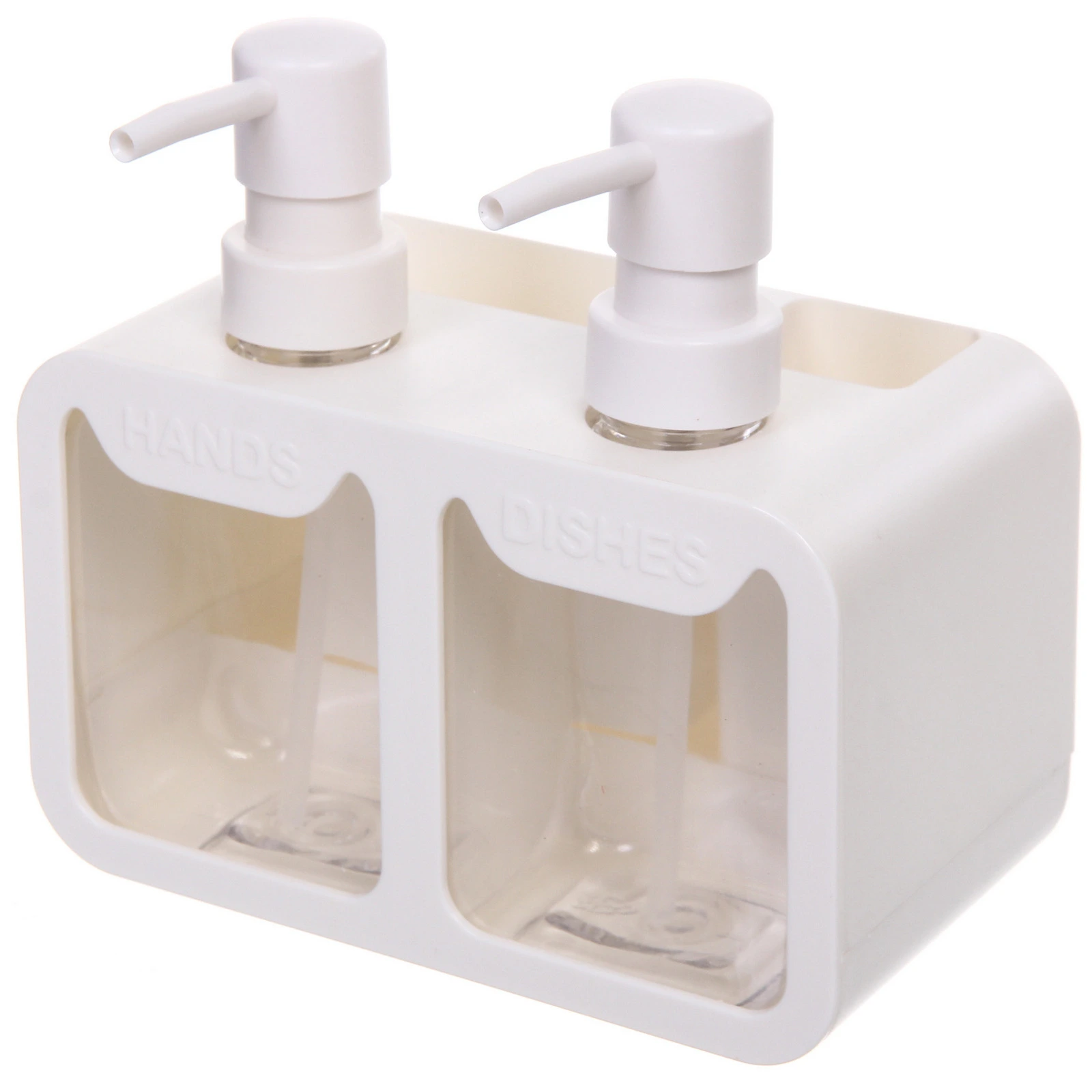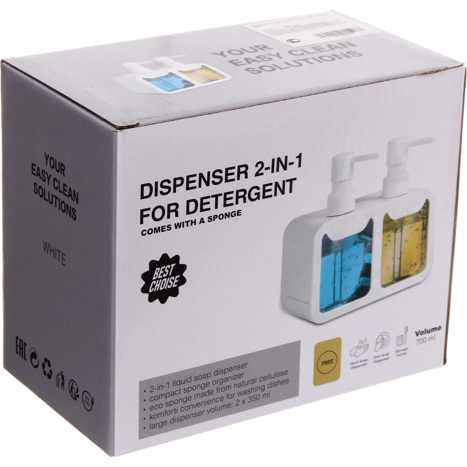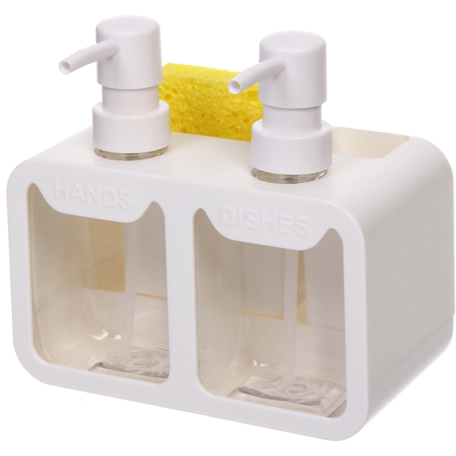Модель оснащена двумя прозрачными резервуарами по 350 мл с помповыми дозаторами. Вы можете использовать один отсек для средства для посуды, второй — для жидкого мыла. На корпусе предусмотрены тисненые обозначения HANDS и DISHES, что упрощает использование. В задней части расположен отдельный отсек для губки, благодаря чему она всегда под рукой и аккуратно хранится.