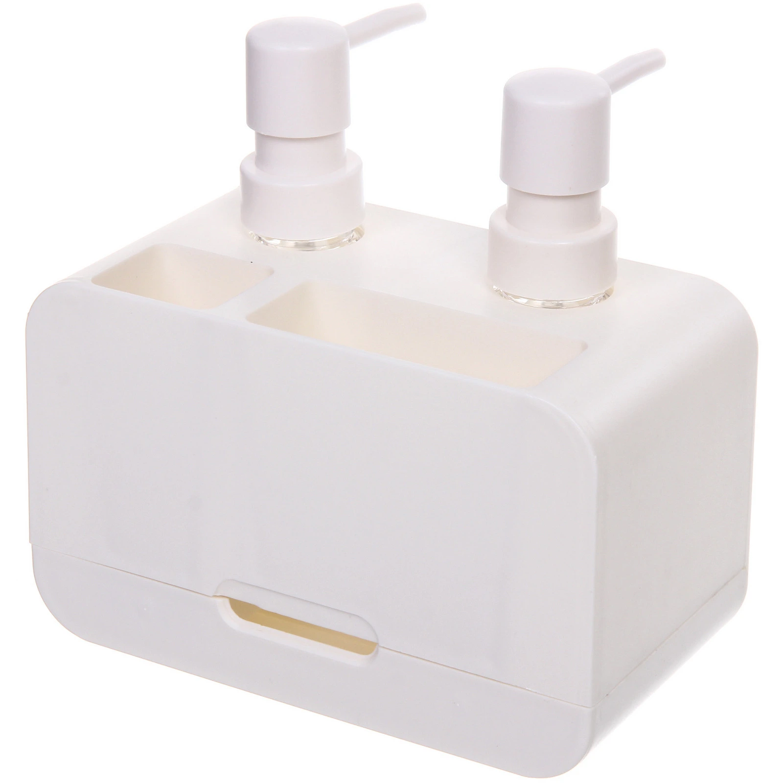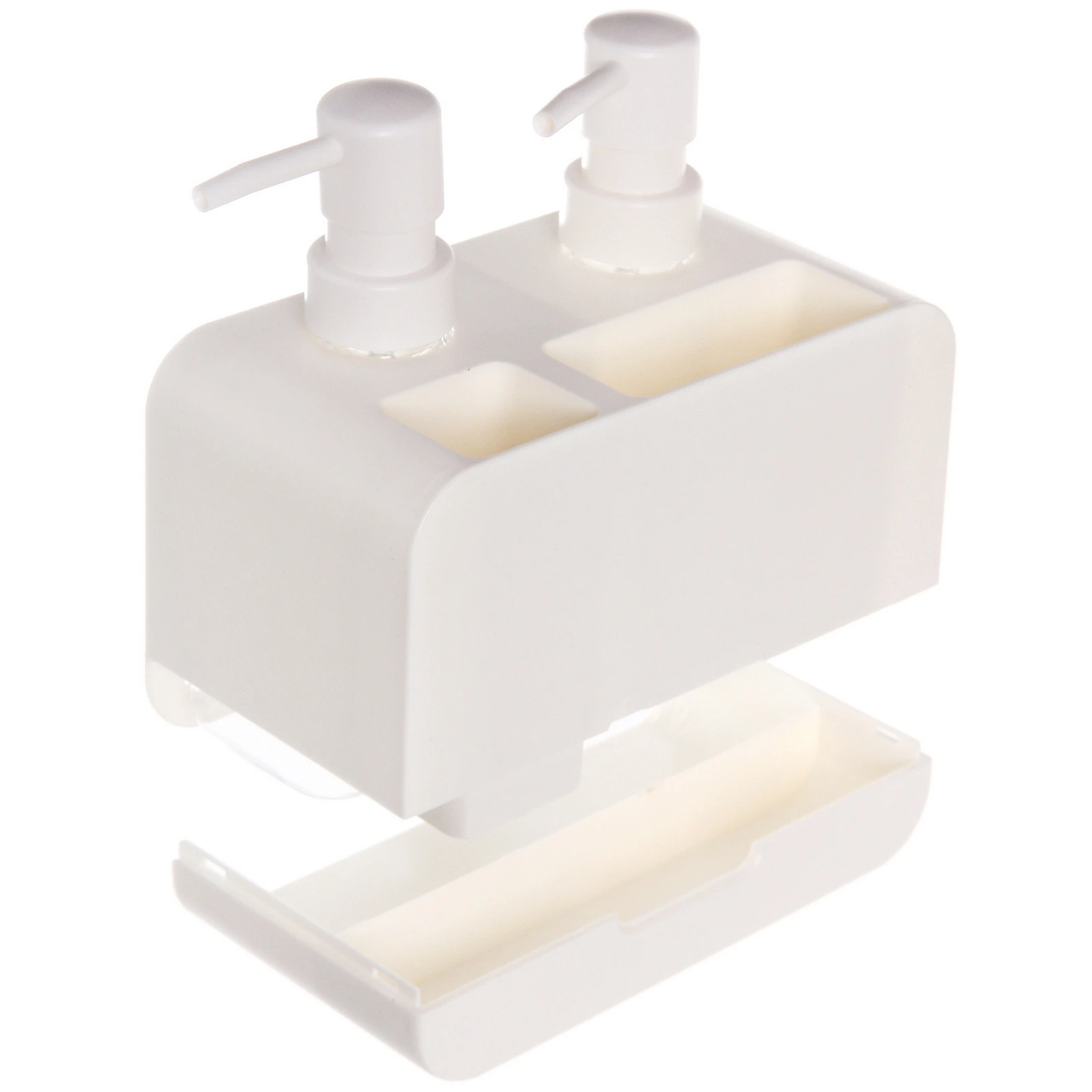 Корпус выполнен из прочного пластика белого цвета и имеет размер 17х19х16 см, что позволяет разместить его даже возле небольшой раковины. Конструкция разборная: нижний поддон легко снимается, а помпы и емкости можно извлечь для очистки. Это делает уход за органайзером простым и гигиеничным.