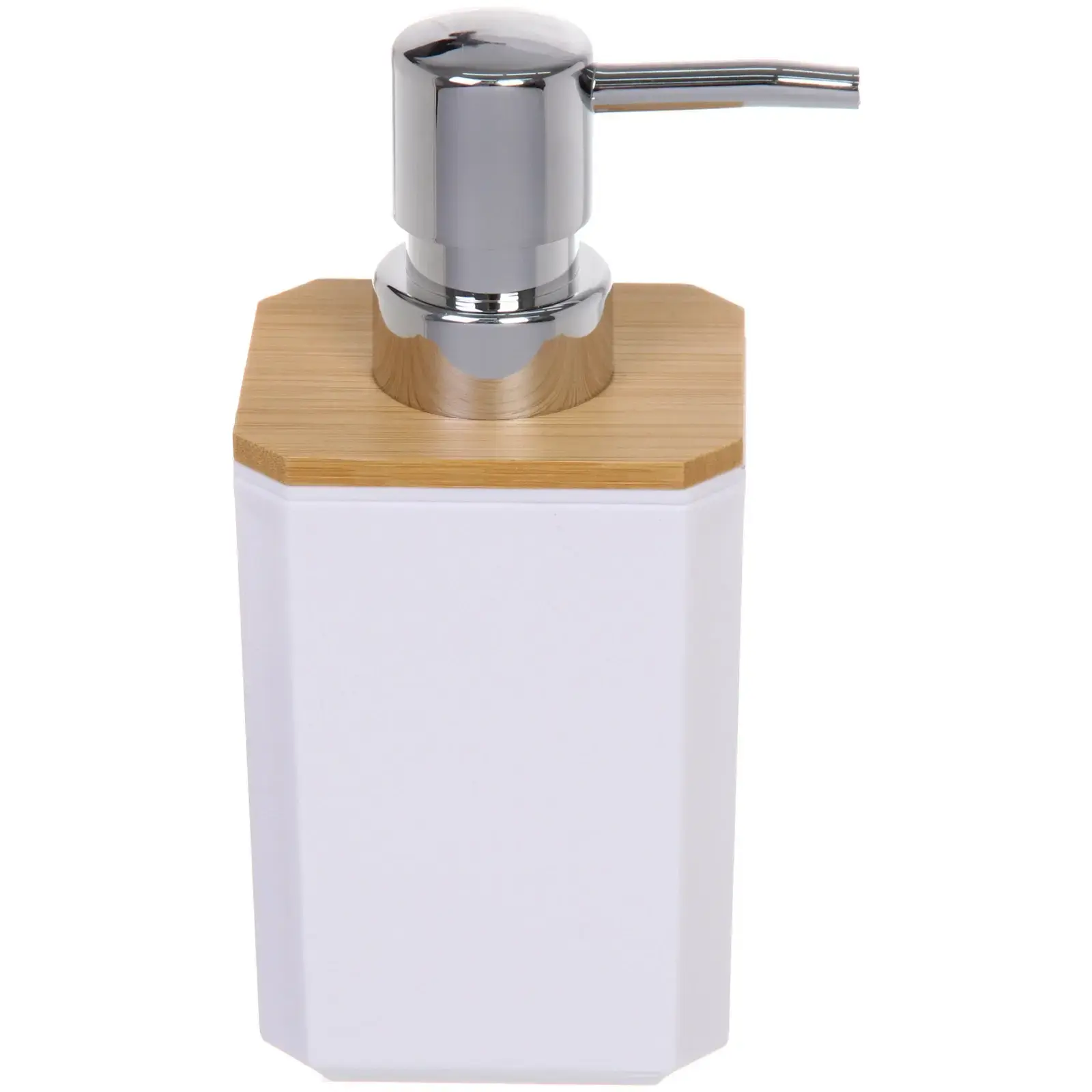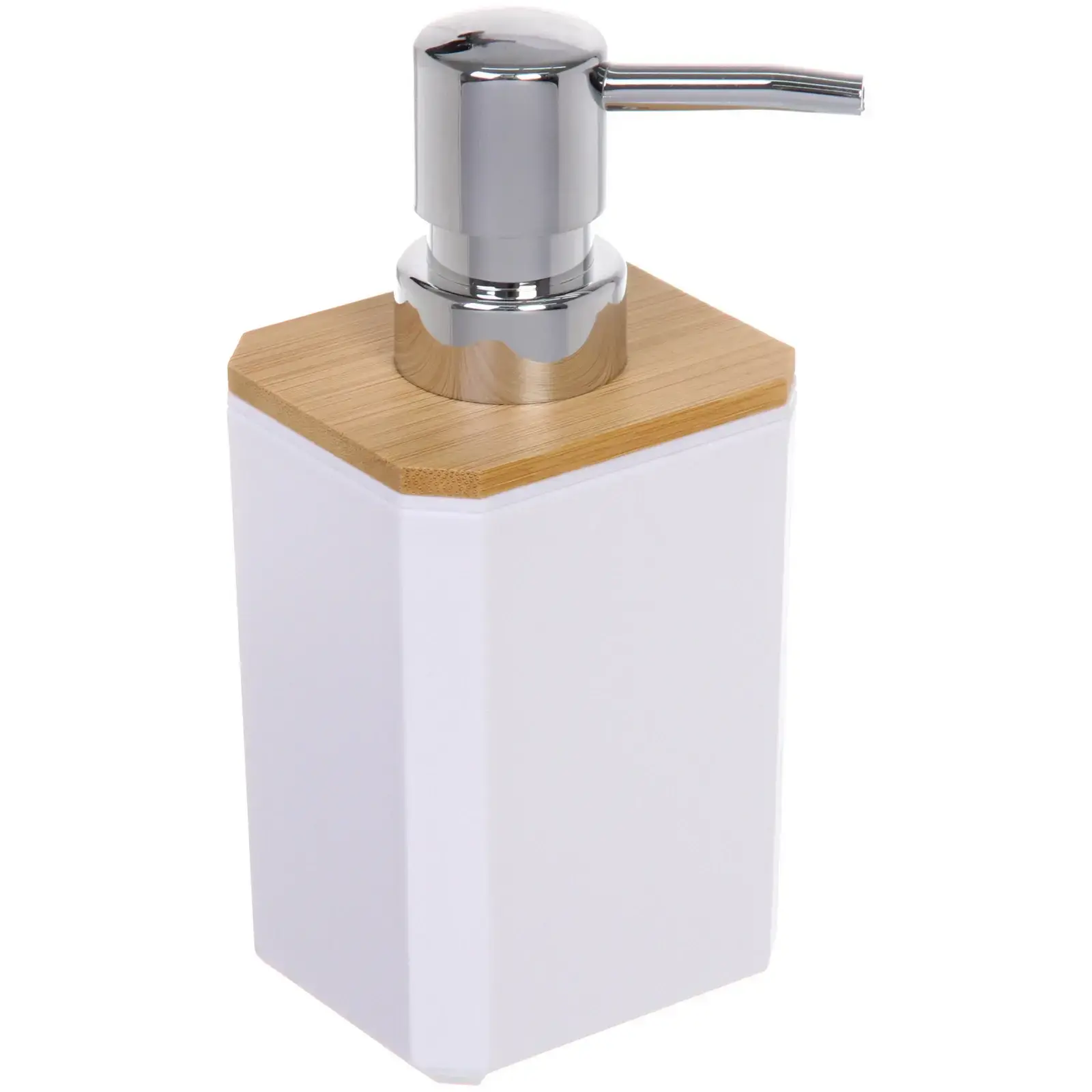 Дозатор выполнен из качественного пластика с верхней частью из бамбука, что придаёт ему современный вид. Металлический насос с хромированным покрытием обеспечивает долговечность и надежность в использовании. Объем контейнера составляет 260 мл, что делает его идеальным для ежедневного использования.