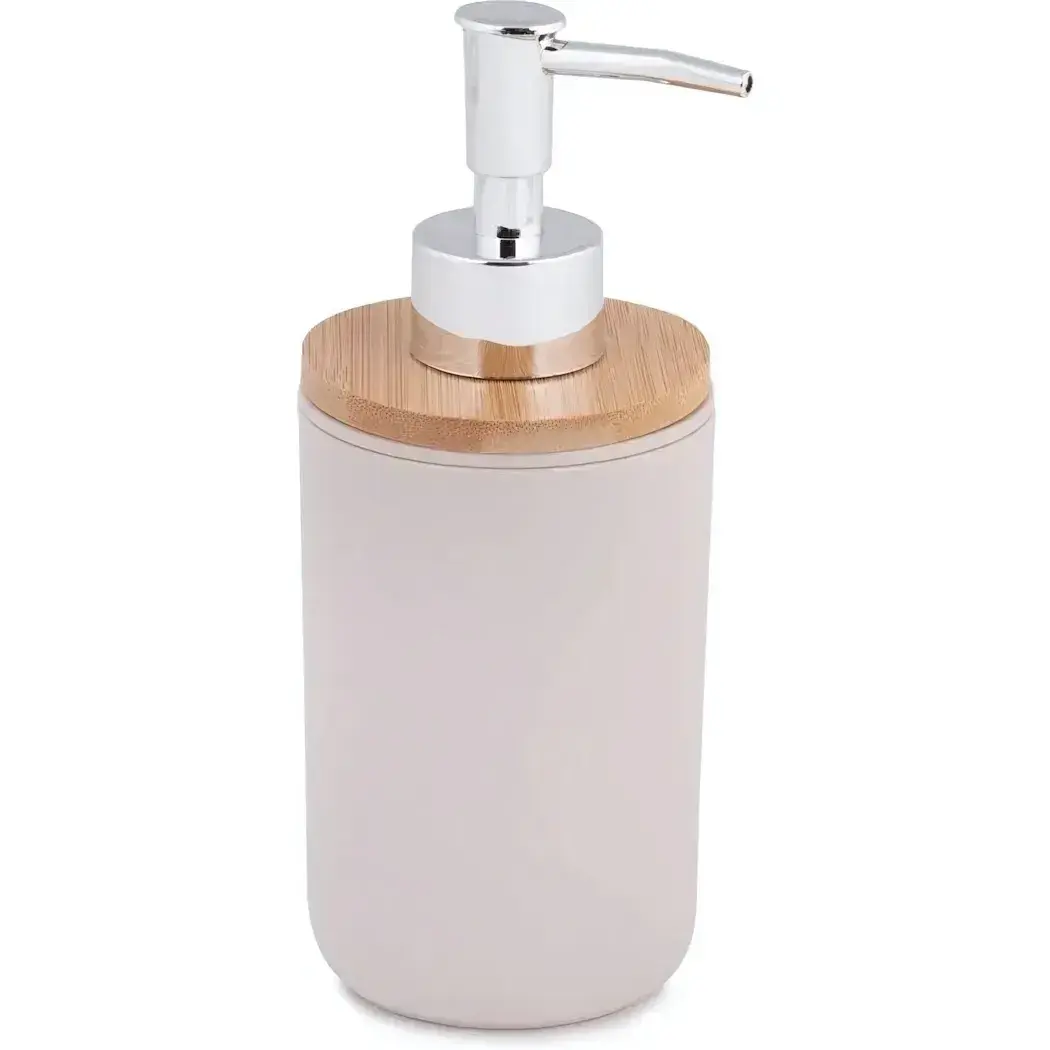 Цилиндрическая форма обеспечивает устойчивость на любой поверхности. Бежевый цвет корпуса создает теплую атмосферу, а сочетание текстур бамбука и металла добавляет интерьеру стильный акцент. Продукт полностью готов к использованию — просто заполните емкость любимым средством.