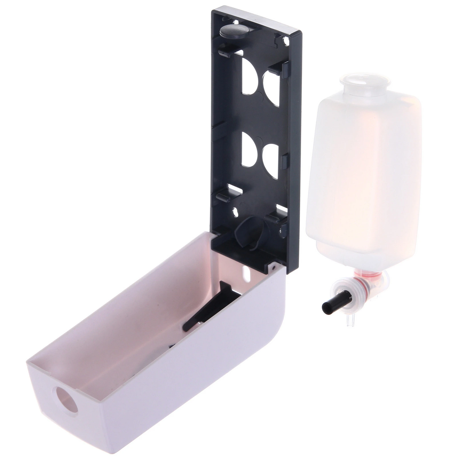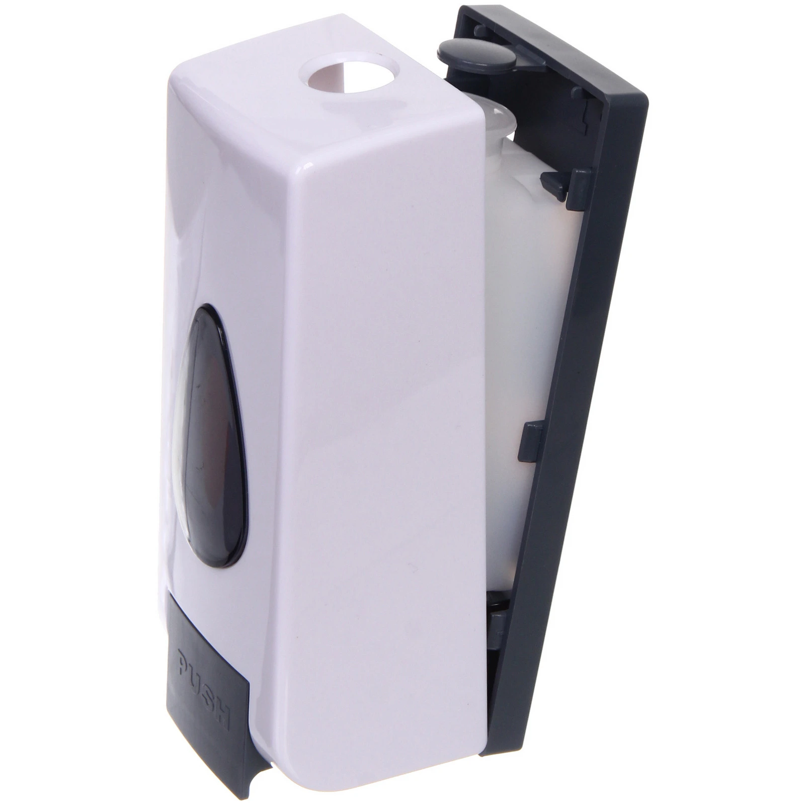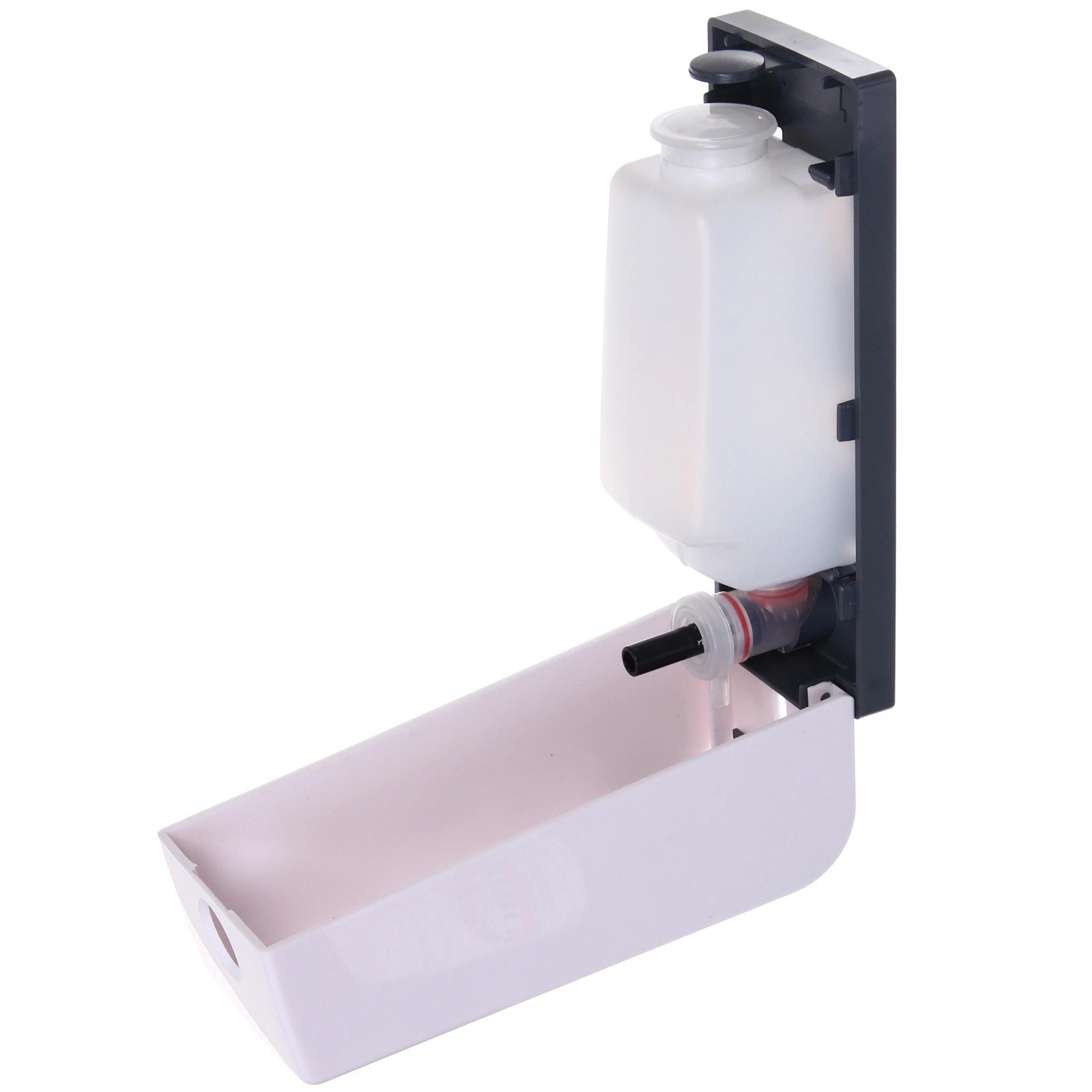 Дозатор крепится к стене, что особенно актуально для небольших помещений и общественных пространств. Полупрозрачное смотровое окно на лицевой панели позволяет контролировать уровень жидкости и вовремя пополнять запас. Внутренний резервуар легко извлекается для наполнения, а откидная крышка обеспечивает быстрый доступ к механизму.