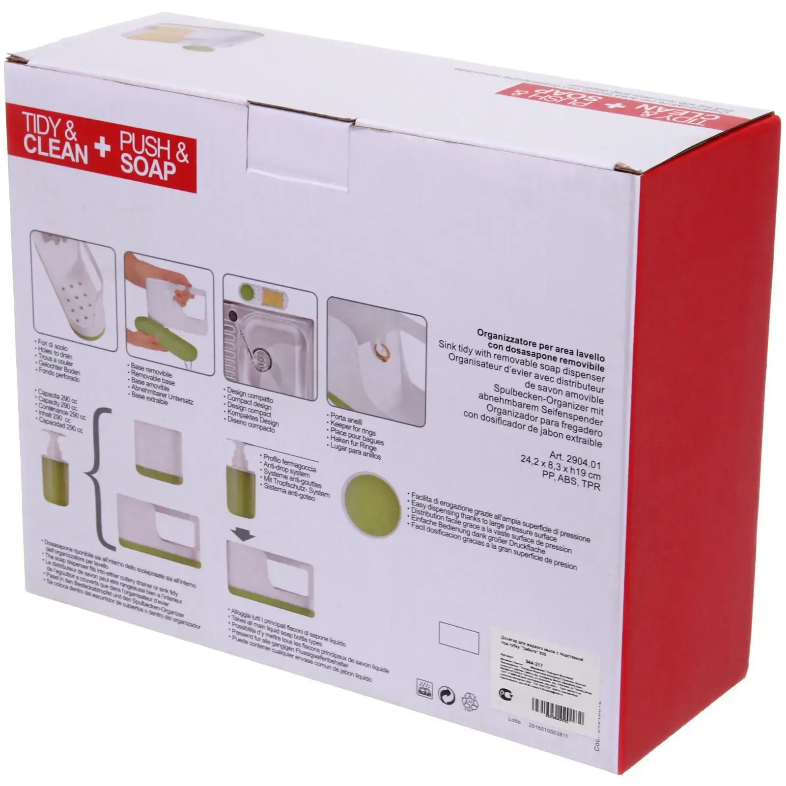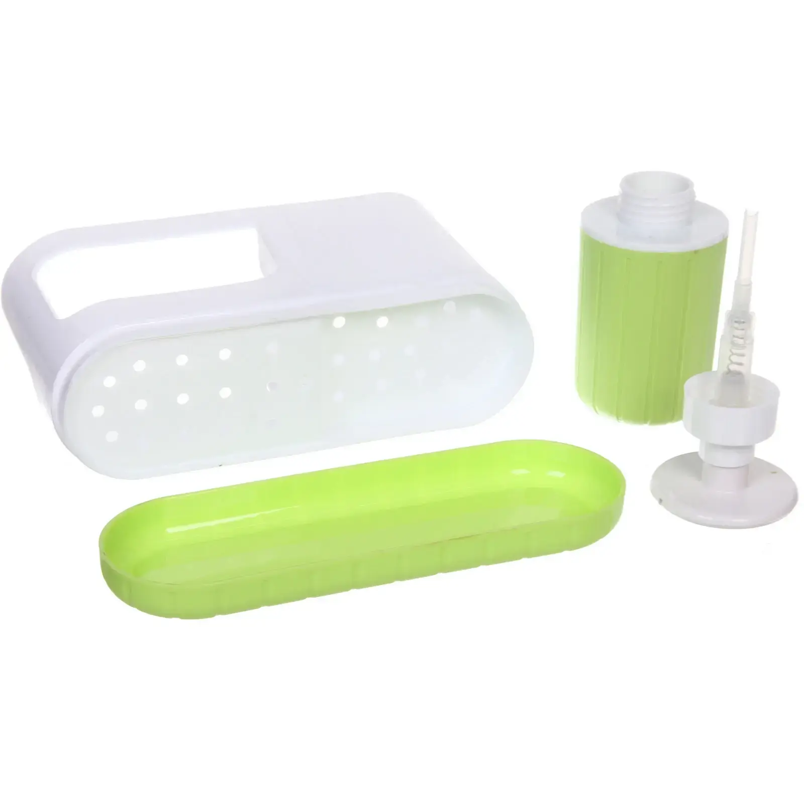 Размеры дозатора составляют 24,2 см в ширину, 8,3 см в глубину и 19 см в высоту. Изготовлен из качественного пластика, который легко чистится и устойчив к воздействию моющих средств. Цветовая гамма включает белый и зеленый, что придает ему свежий и современный вид.