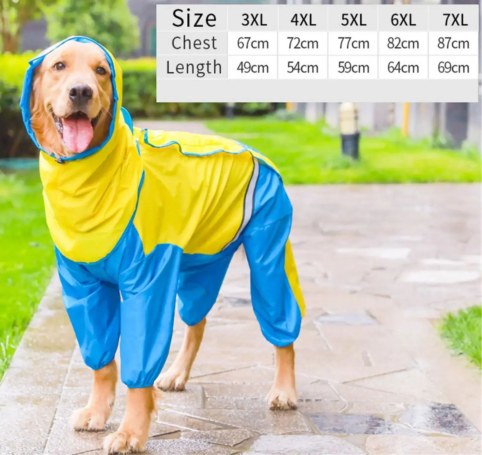 Дождевик предназначен для крупных пород собак и имеет размер 3XL, что делает его идеальным выбором для таких собак, как золотистые ретриверы или лабрадоры. Он легко надевается благодаря удобной застёжке и капюшону, который защищает голову вашего питомца от дождя. Дождевик также оснащён резинками на манжетах и штанинах для лучшей фиксации, что предотвращает попадание влаги внутрь.