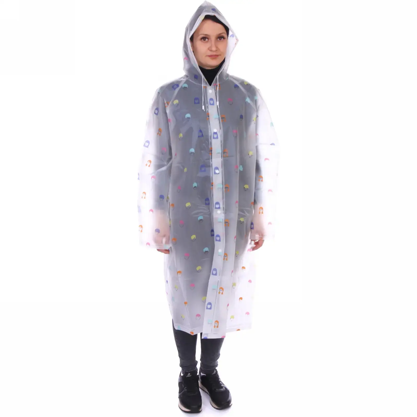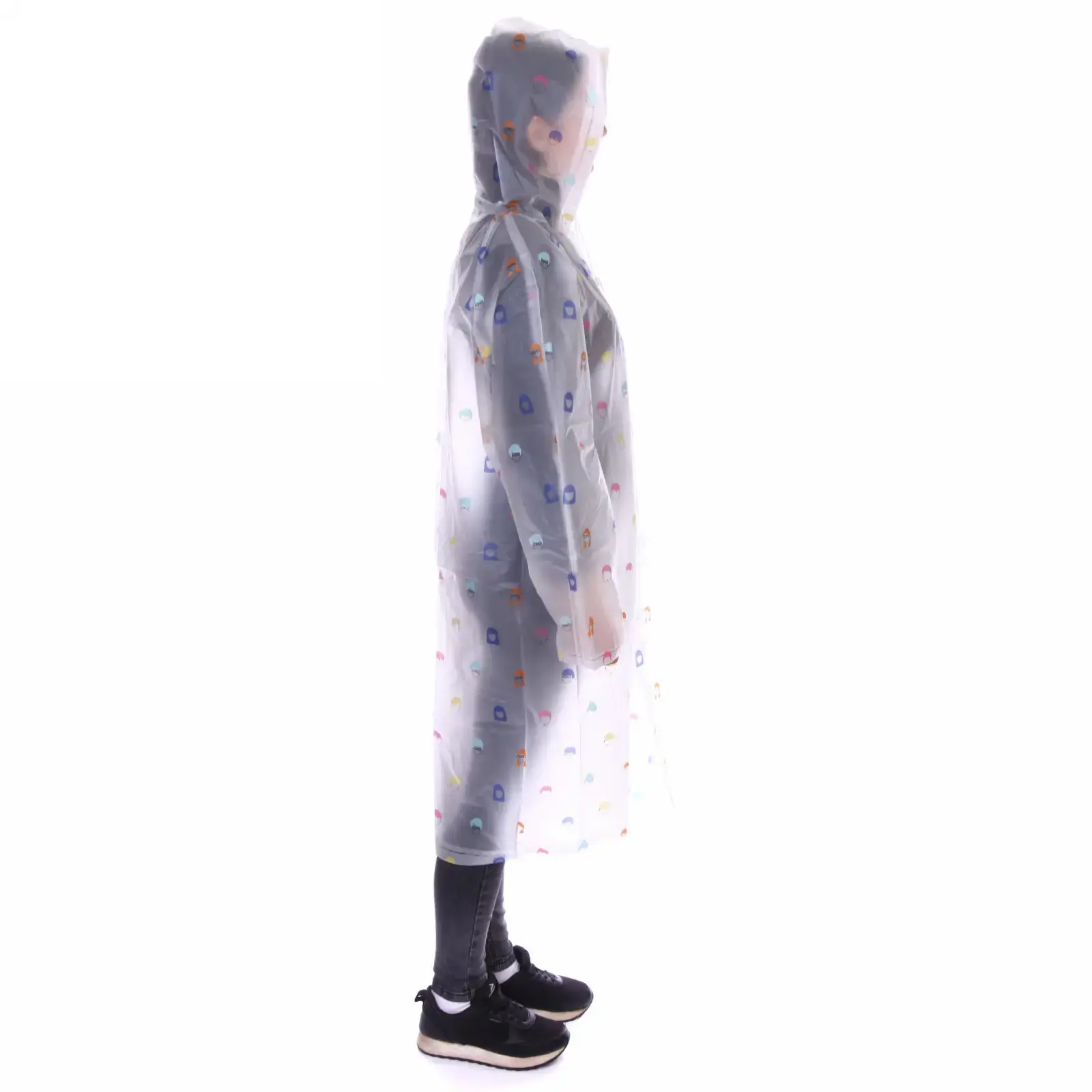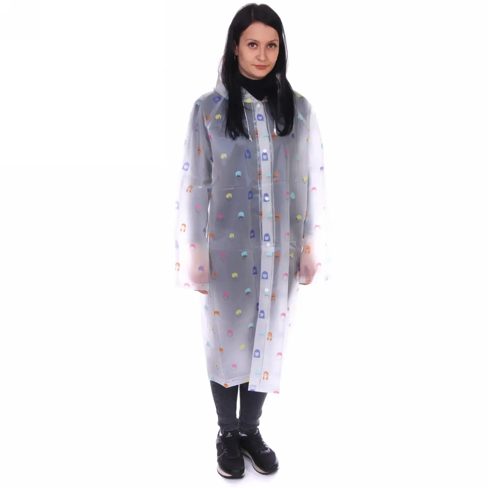 Прозрачный дождевик с ярким принтом станет вашим верным спутником в непогоду. Лёгкий материал ПВХ не пропускает влагу, а свободный крой позволяет носить плащ поверх любой одежды.