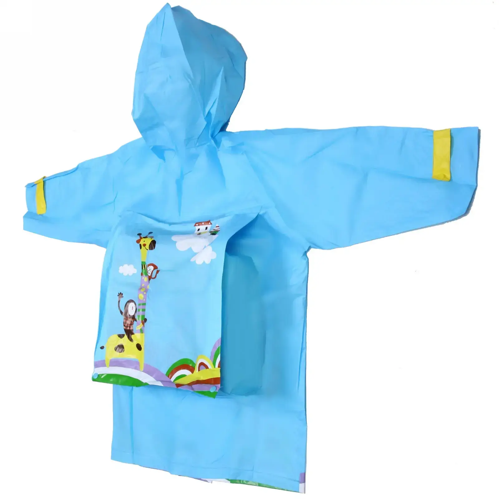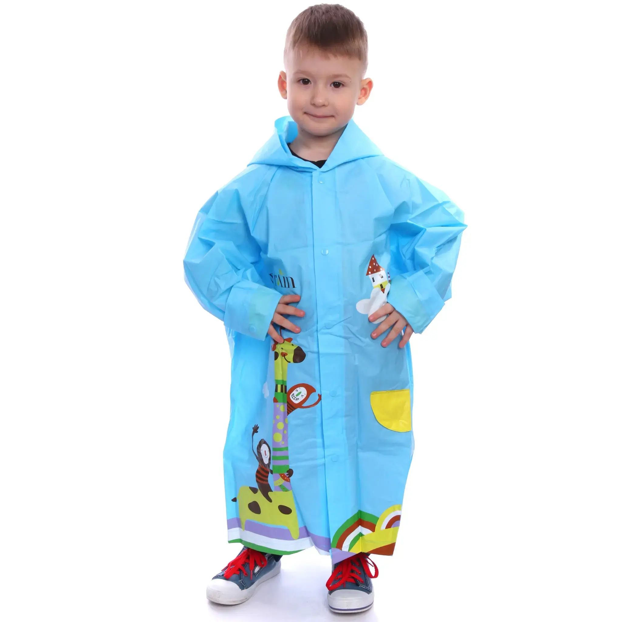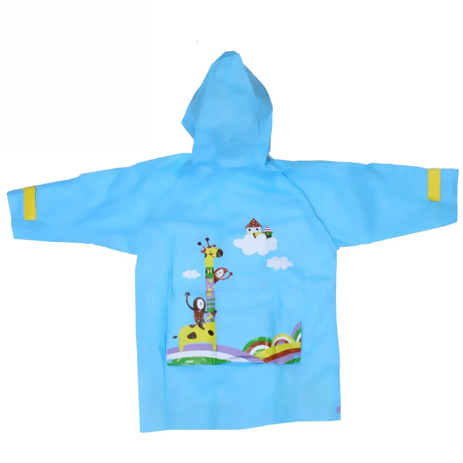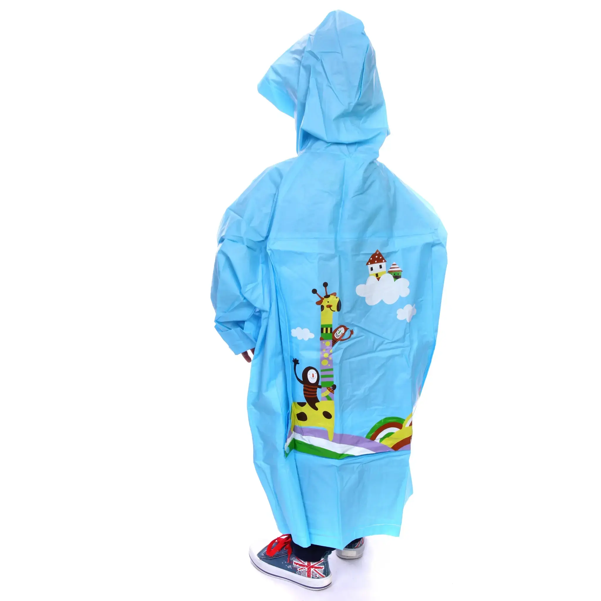 Представляем вашему вниманию детский дождевик-плащ, который станет надежным защитником вашего ребенка от непогоды. Этот яркий и красочный дождевик выполнен в голубом цвете с мультяшными рисунками жирафа и облаков, что обязательно понравится вашему малышу. Благодаря качественному водоотталкивающему материалу, плащ обеспечивает комфорт и свободу движений даже во время активных игр под дождем.
