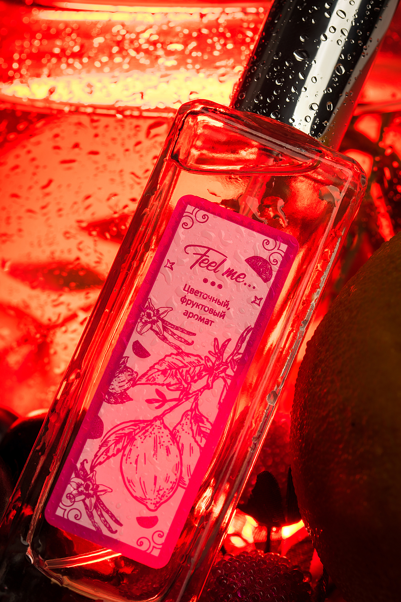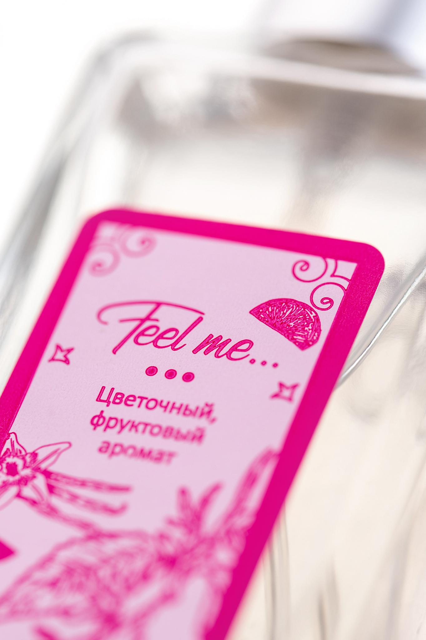 Флакон в виде прозрачного прямоугольника с серебристой крышкой сочетает минимализм и элегантность. Розовая этикетка с надписью «Feel me...» добавляет ноту романтичности, а квадратное основание обеспечивает устойчивость на любой поверхности.