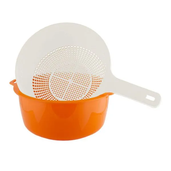 Диаметр миски и сита составляет примерно 19 см, что делает набор достаточно вместительным для большинства кухонных задач, но при этом компактным для хранения. Яркий оранжевый цвет миски и классический белый цвет сита создают стильное сочетание, которое будет гармонично смотреться в интерьере любой кухни.