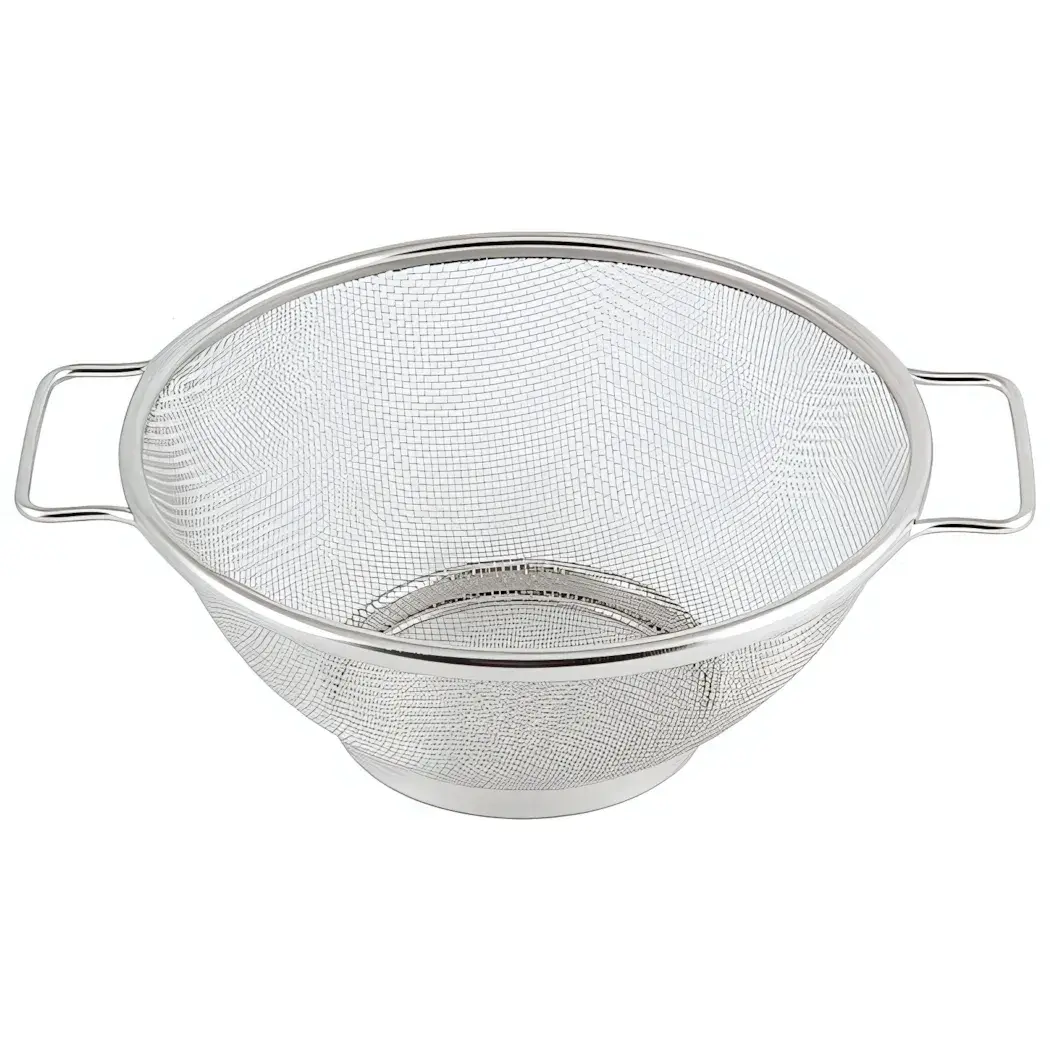 Размер друшлага составляет 26 см в диаметре, что делает его достаточно вместительным для различных задач. Его глубокая форма позволяет удобно промывать даже большие объемы продуктов. Структура поверхности выполнена в виде металлической сетки с мелкими ячейками, что обеспечивает надежное процеживание.