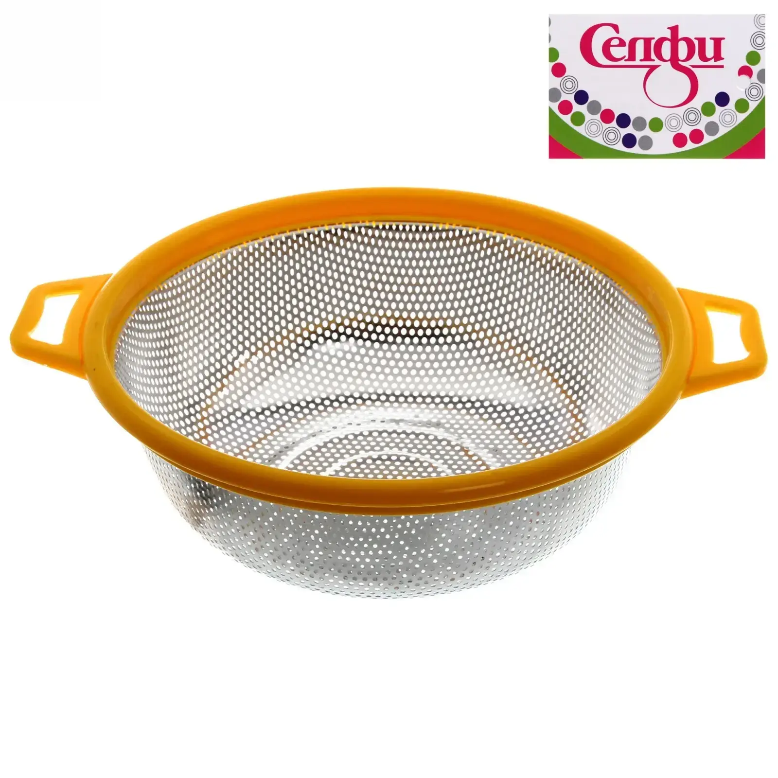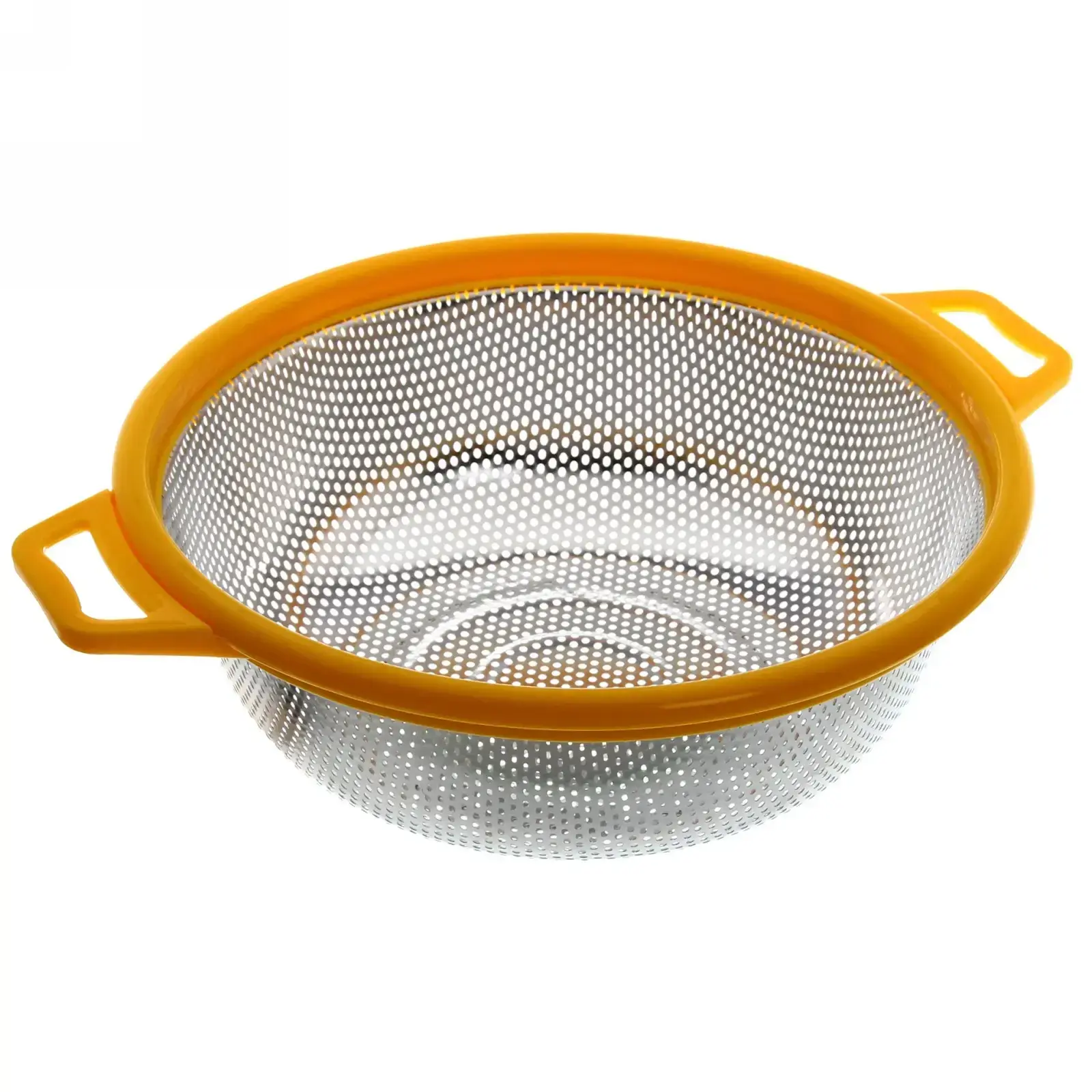 Металлический материал обеспечивает долговечность и устойчивость к коррозии, а желтая пластиковая ручка гарантирует удобный захват. Две боковые ручки позволяют легко удерживать дуршлаг даже с полными продуктами. Его округлая форма и легкий вес делают его простым в использовании и хранении.