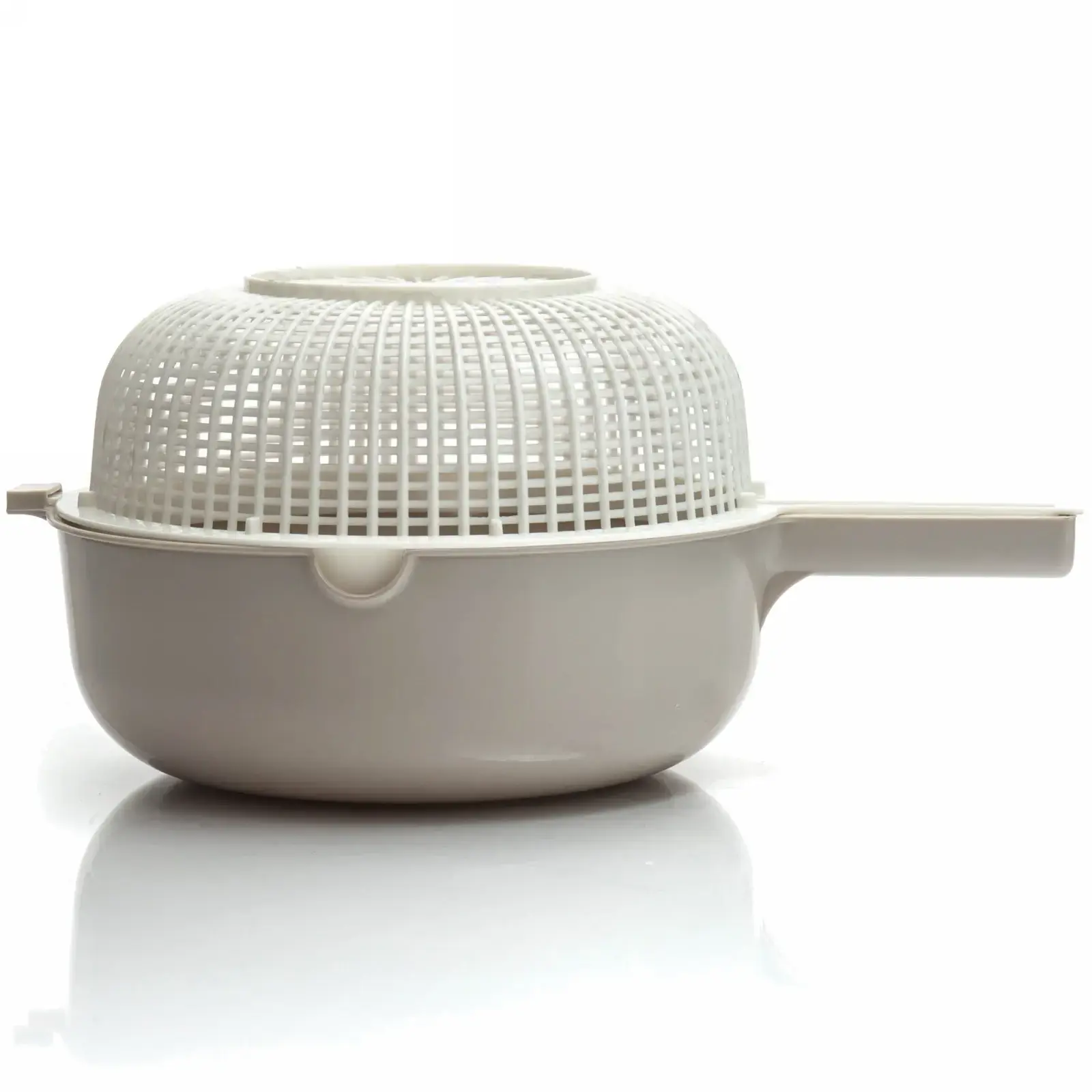Двойной дуршлаг позволяет сливать воду с продуктов, не опасаясь, что часть из них попадет в раковину. Это особенно удобно при мытье ягод и фруктов, так как вода стекает вниз, и вам не нужно подбирать дополнительную чашку для сбора жидкости. Дуршлаг идеально подходит для использования как в домашних условиях, так и на даче, что делает его универсальным аксессуаром для любой кухни.