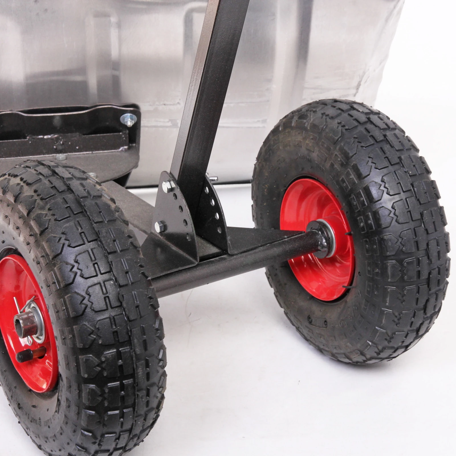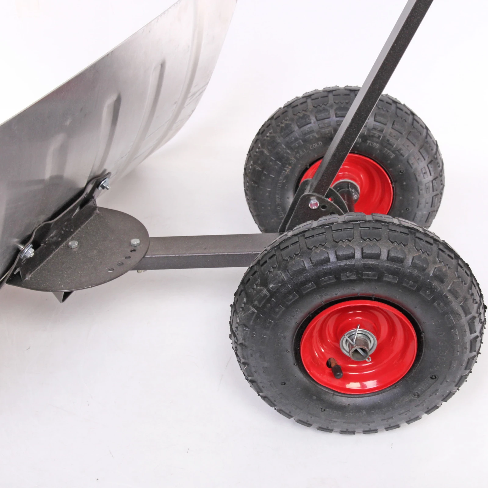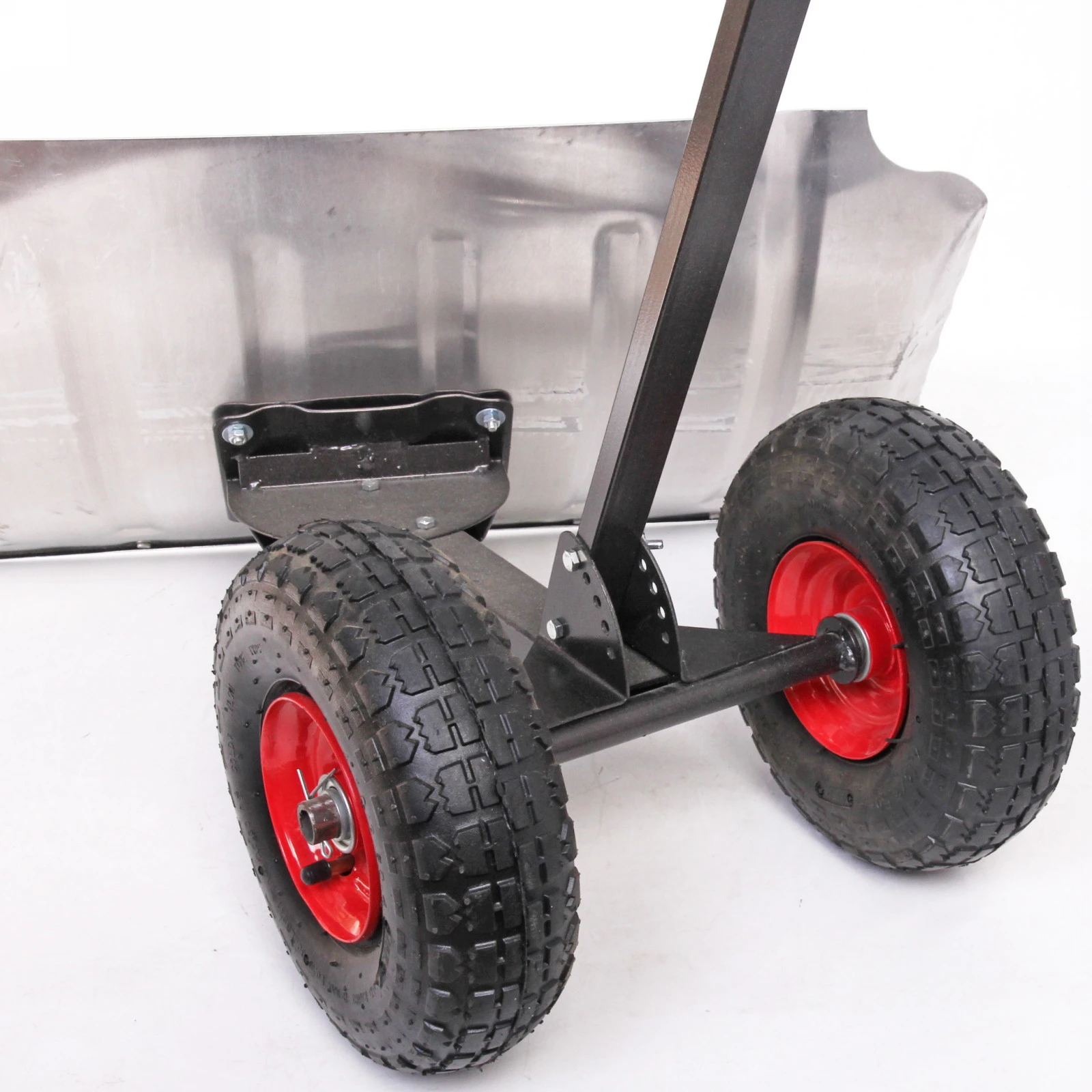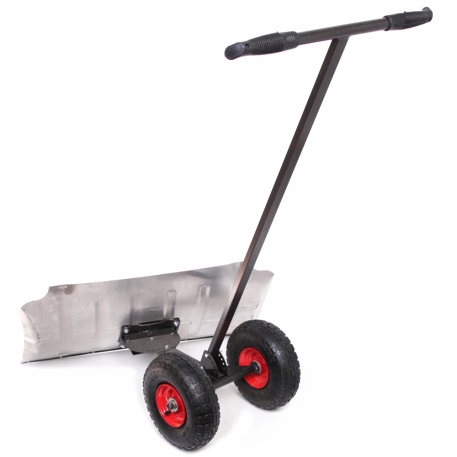 Размер рабочей части движка составляет 750х430 мм, что обеспечивает достаточную площадь для эффективной уборки. Конструкция ручки выполнена из прочного черного металла с прорезиненной насечкой для удобного хвата. Движок также имеет два больших колеса с рифленым протектором и красными ободами, что обеспечивает отличное сцепление с поверхностью и легкость в управлении.