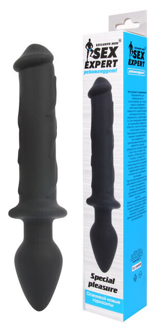 Двусторонний стимулятор «Sex Expert», силикон, черный, 23 см (фаллос 15 см, пробка 8 см)