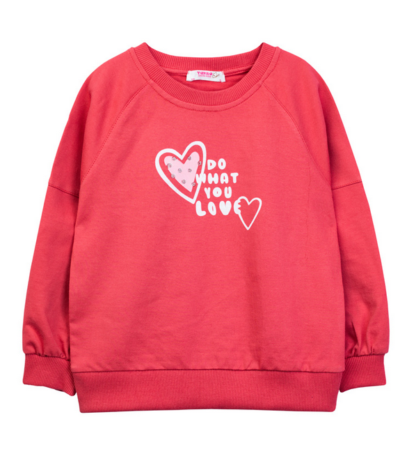 Яркий коралловый цвет и жизнерадостный принт с надписью «DO WHAT YOU LOVE» создают настроение для активного дня. Удобный крой с регланом обеспечивает свободу движений, а эластичные резинки на рукавах и подоле сохранят идеальную посадку.