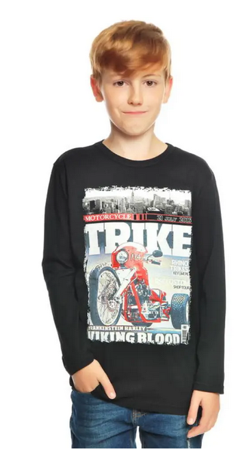 Этот джемпер идеально подходит для мальчиков 5 лет. Черный цвет делает его практичным и стильным. Графический принт с мотоциклом и надписями "MOTORCYCLE", "TRIKE", "VIKING BLOOD" добавляет образу динамичности и современности.