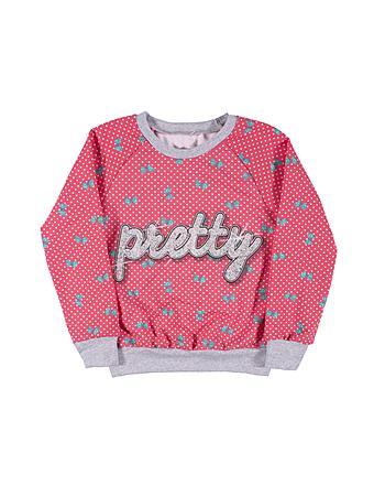 Идеальная вещь для повседневной носки: сочетает нежность хлопка с стильным дизайном. Нежный розовый фон с белым горошком и голубыми цветами создает неповторимый образ, а надпись «pretty» добавляет игривый акцент.