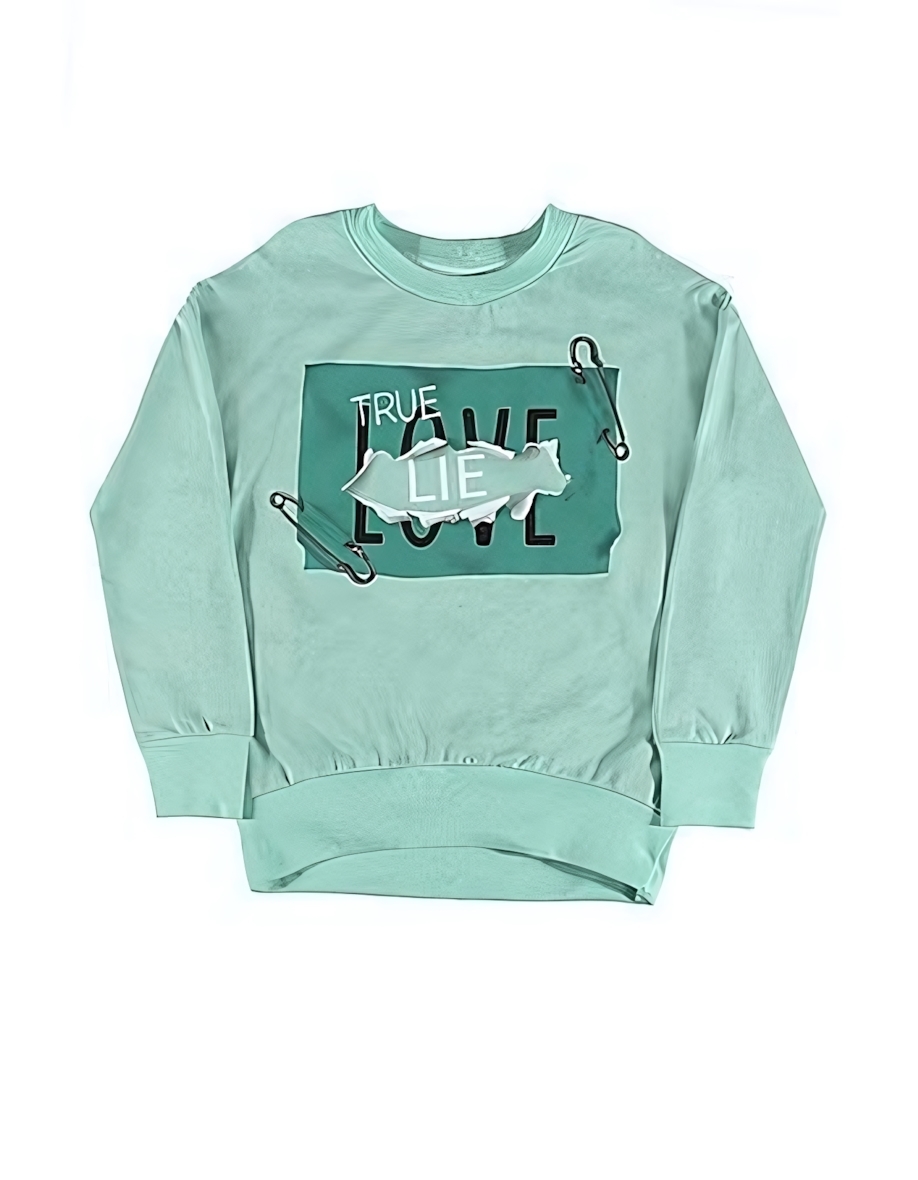 Этот стильный и уютный джемпер идеально подходит для девочек. Сшитый из 100% хлопка, он обеспечивает максимальный комфорт в любой сезон. Его мятный цвет добавит яркости в гардероб вашей девочки, а оригинальный графический принт с надписями «TRUE», «LOVE» и «LIE» станет отличным дополнением к любому образу.