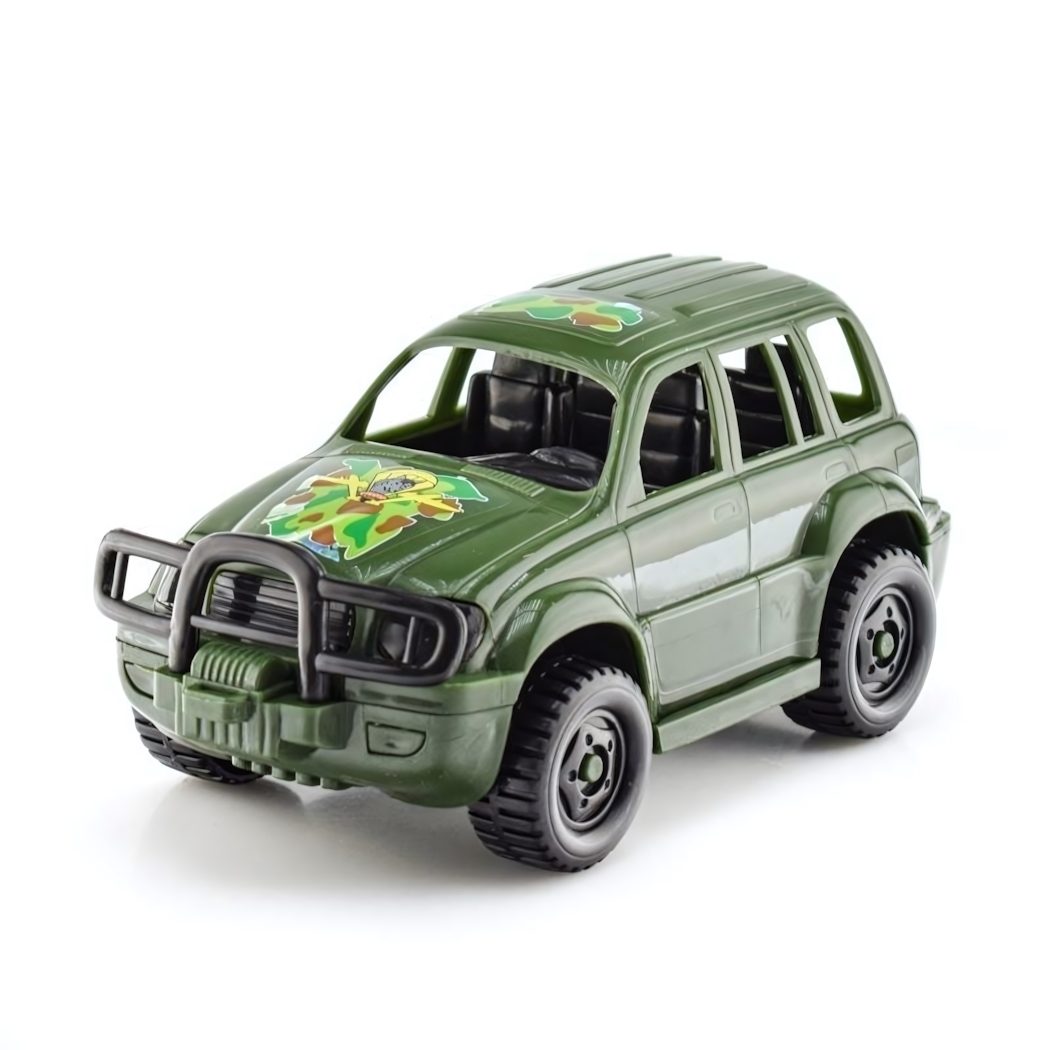 Яркий джип с камуфляжным дизайном станет любимой игрушкой для развития моторики и воображения. Безопасные закруглённые края и прочный пластик обеспечат долгие годы активных игр.