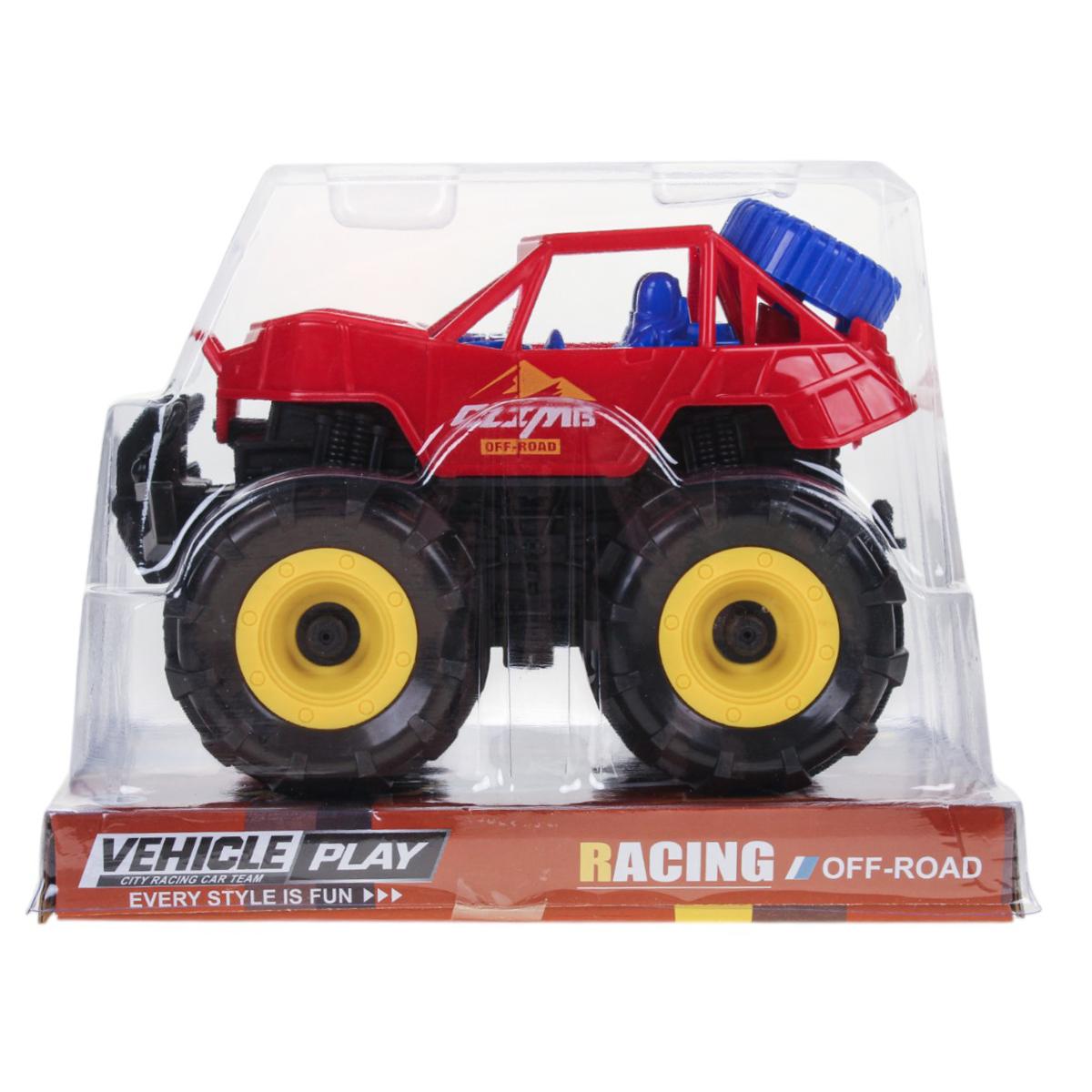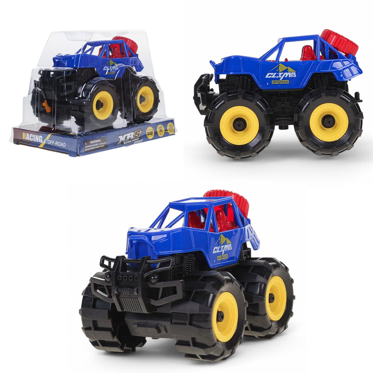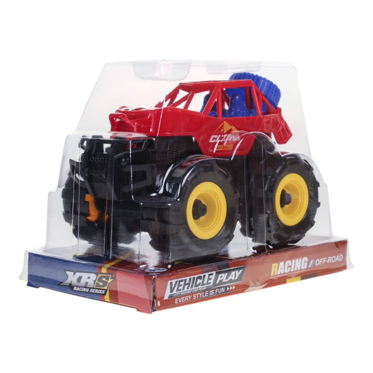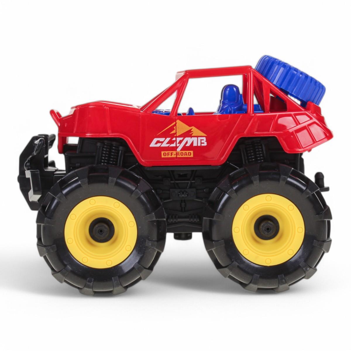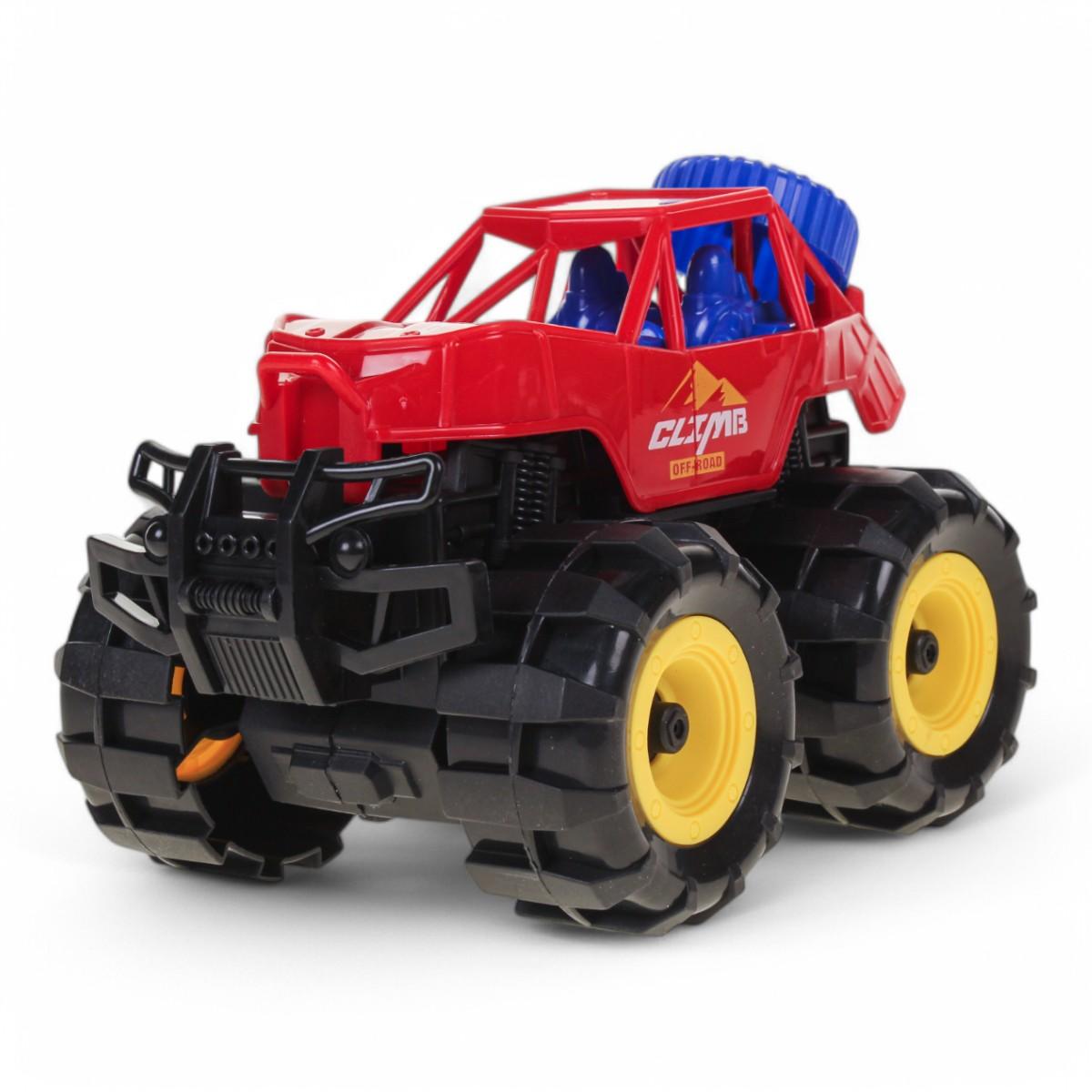 Машинка оснащена реалистичными элементами: защитная рама, запасное колесо и декоративный контейнер. Яркие цвета (красный/синий) и стильные наклейки 'CLIMB OFF-ROAD' привлекают внимание детей.