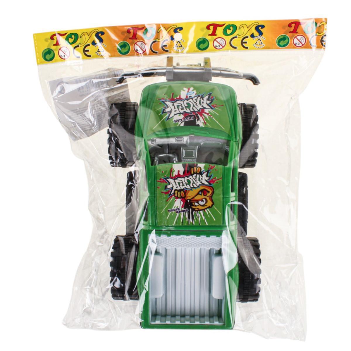Большие колеса и детализированный дизайн создают ощущение настоящего внедорожника. Размер 20х11.5х9 см делает игрушку удобной для детской руки. Яркие цвета (зеленый, красный, синий) привлекают внимание и радуют глаз.