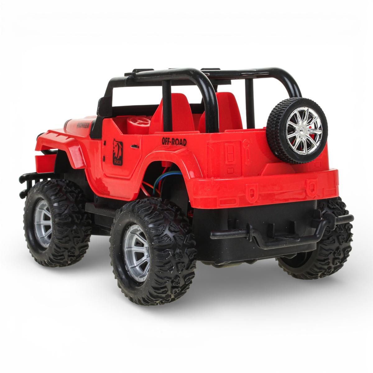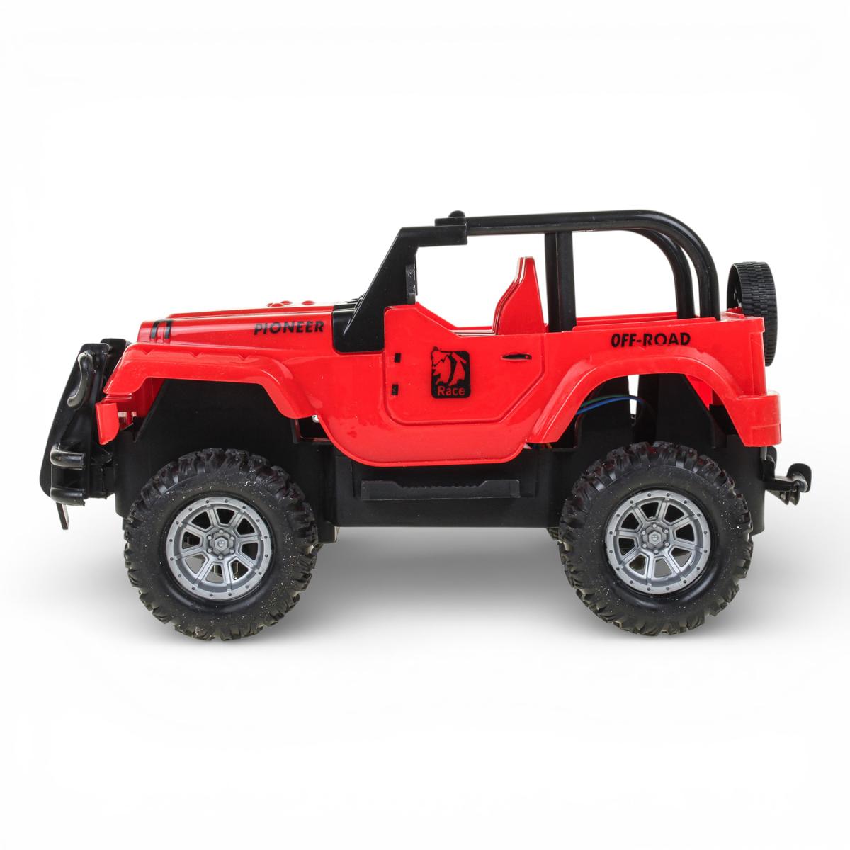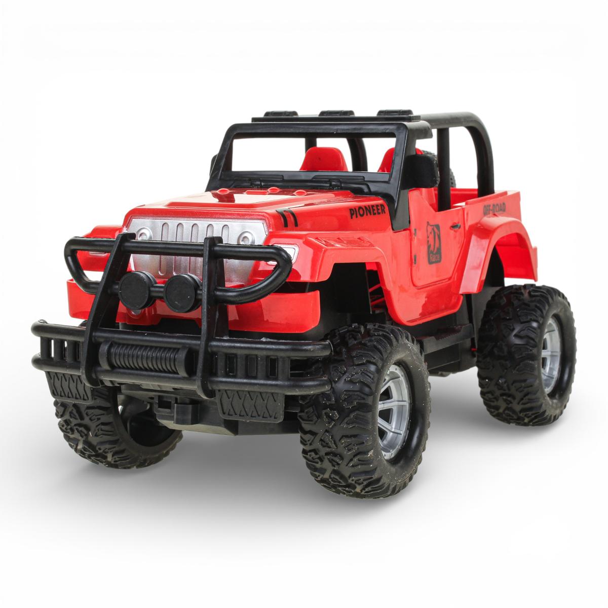 Корпус выполнен из прочного пластика, устойчивого к активной игре. Детализированный дизайн с каркасом безопасности, запасным колесом и внедорожными элементами делает джип особенно привлекательным для любителей техники. Оптимальный размер машинки — около 24 см в длину — обеспечивает баланс между компактностью и устойчивостью во время движения.