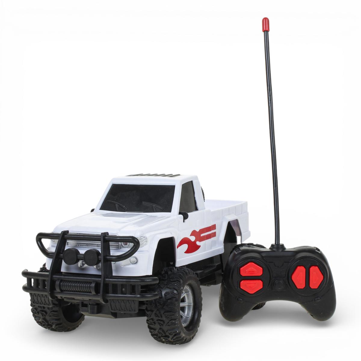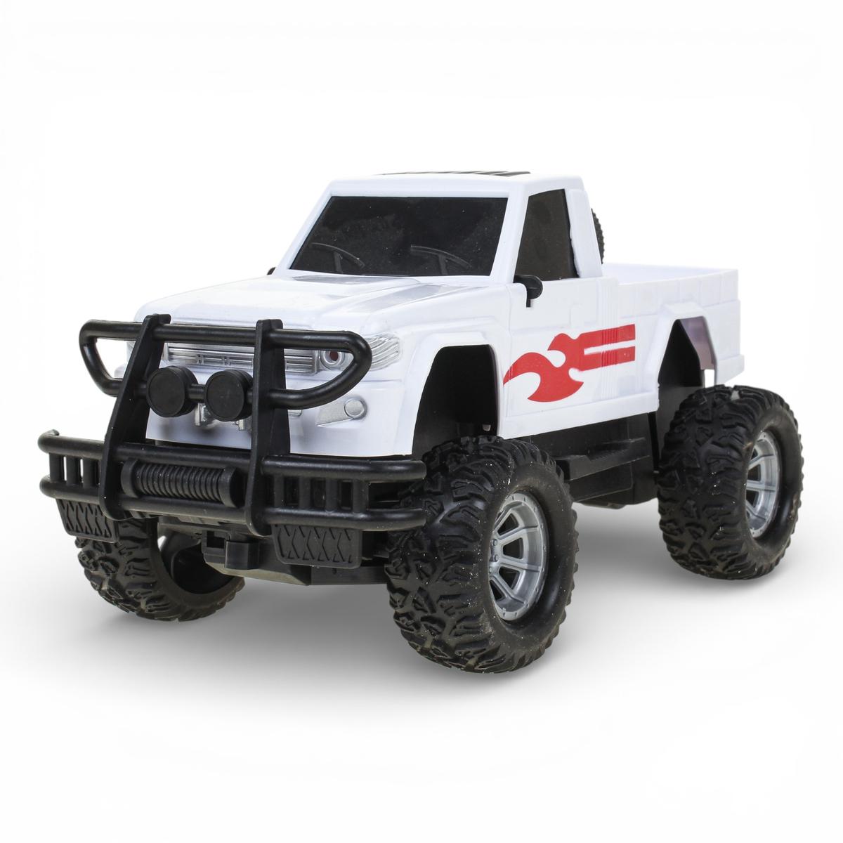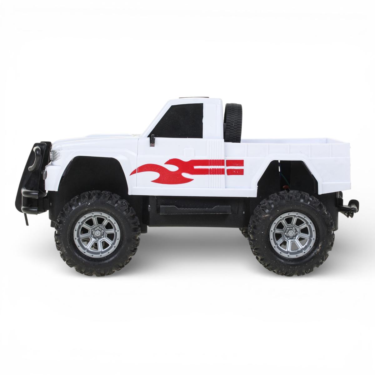 Корпус выполнен из прочного пластика. Размер машинки — 24×11,5×13 см, что делает ее удобной для игры в комнате и на улице. Детализированный кузов пикапа, массивные бамперы, запасное колесо и крупные колеса создают реалистичный образ внедорожника и усиливают интерес к игре.