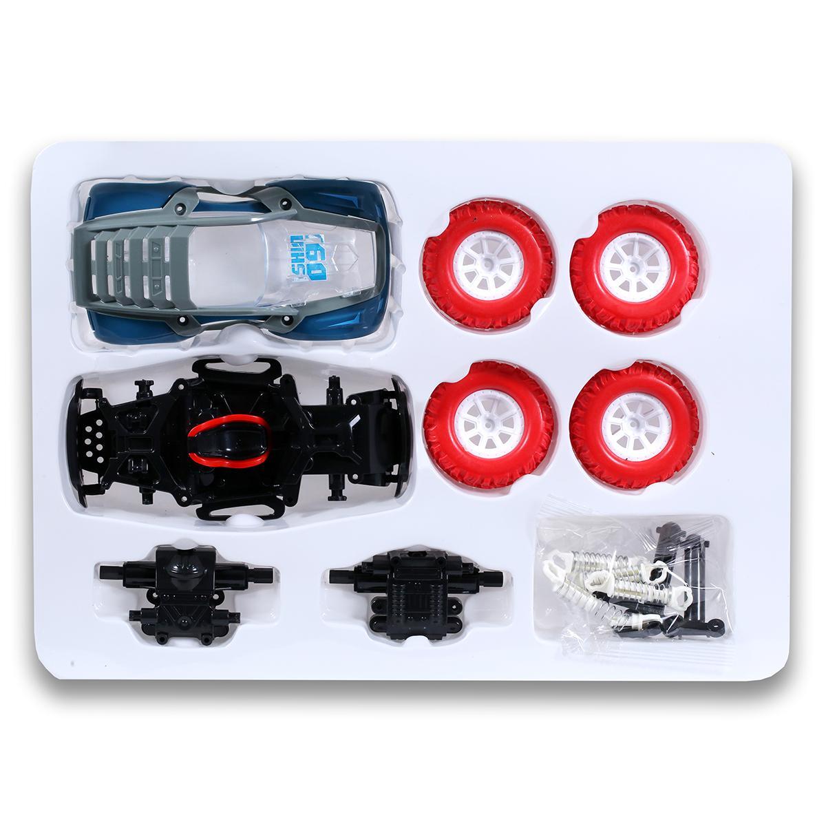 После сборки машинка приводится в движение инерционным механизмом — достаточно откатить её назад и отпустить. Крупные красные колёса с протекторами легко преодолевают препятствия, а голубой кузов с серыми акцентами выглядит стильно.