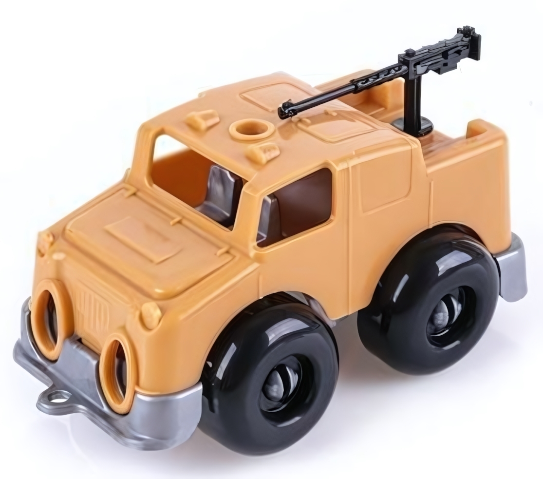 Квадратный кузов с закругленными углами из экологичного пластика. Реалистичный дизайн с элементами внедорожника: рельефные фары, имитация защитной рамы и протекторов на колесах. Совместим с большинством игрушечных фигурок стандартного размера.