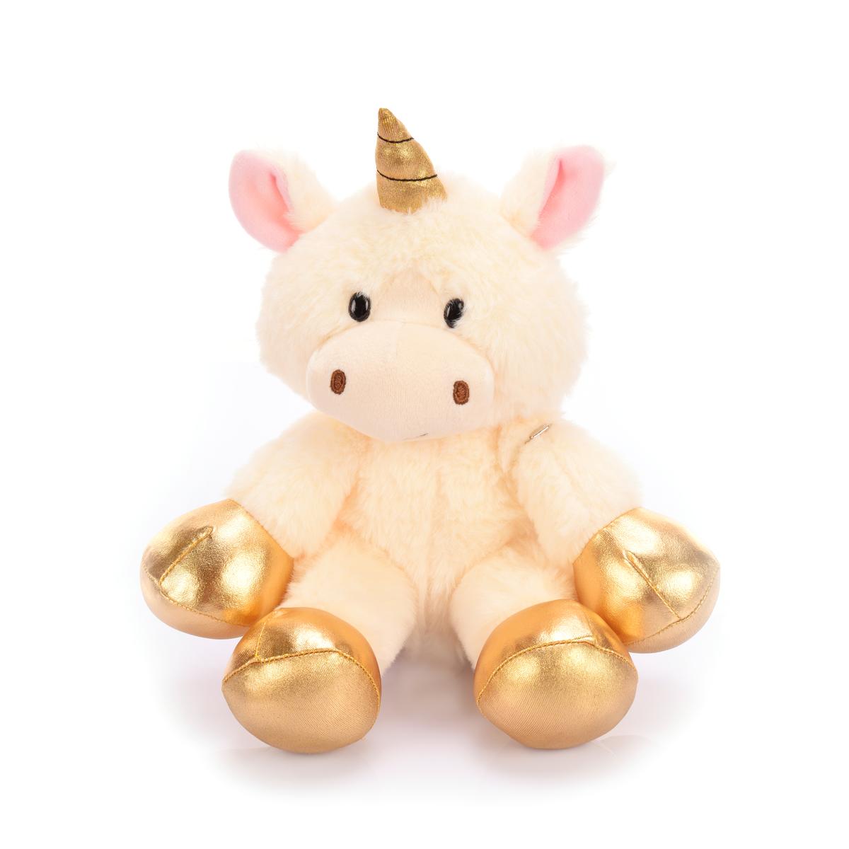 Игрушка выполнена из мягкого текстиля, наполненного гипоаллергенным материалом. Золотистый рог и лапки создают уникальный контраст с нежным розовым телом. Размер идеально подходит для комфортных объятий.