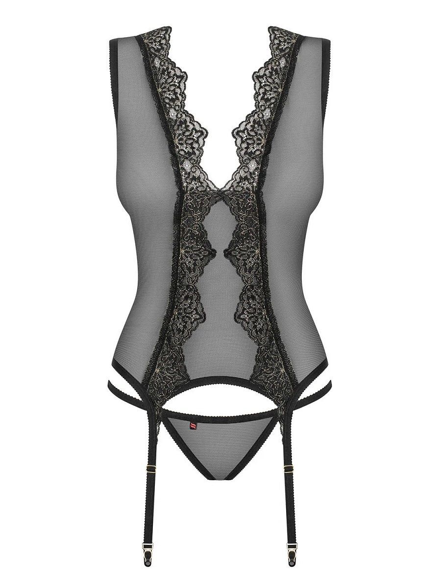 Корсаж отлично сочетается с чулками и высокими каблуками. В комплект входят трусики-стринги, что делает образ завершенным. Подходит для особенных моментов и романтических встреч.