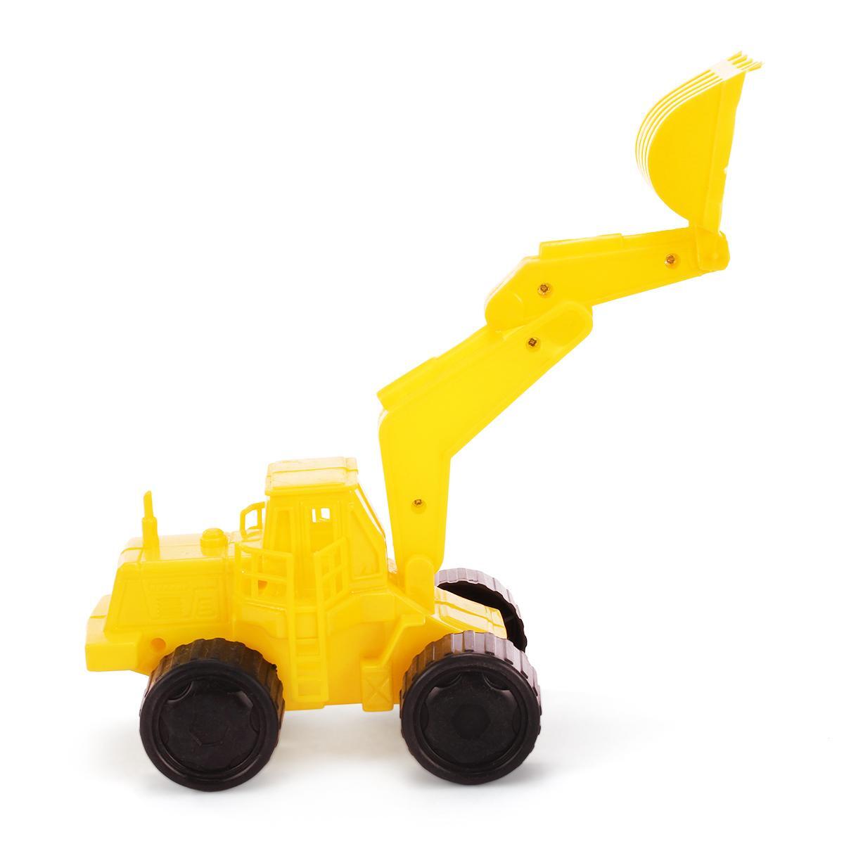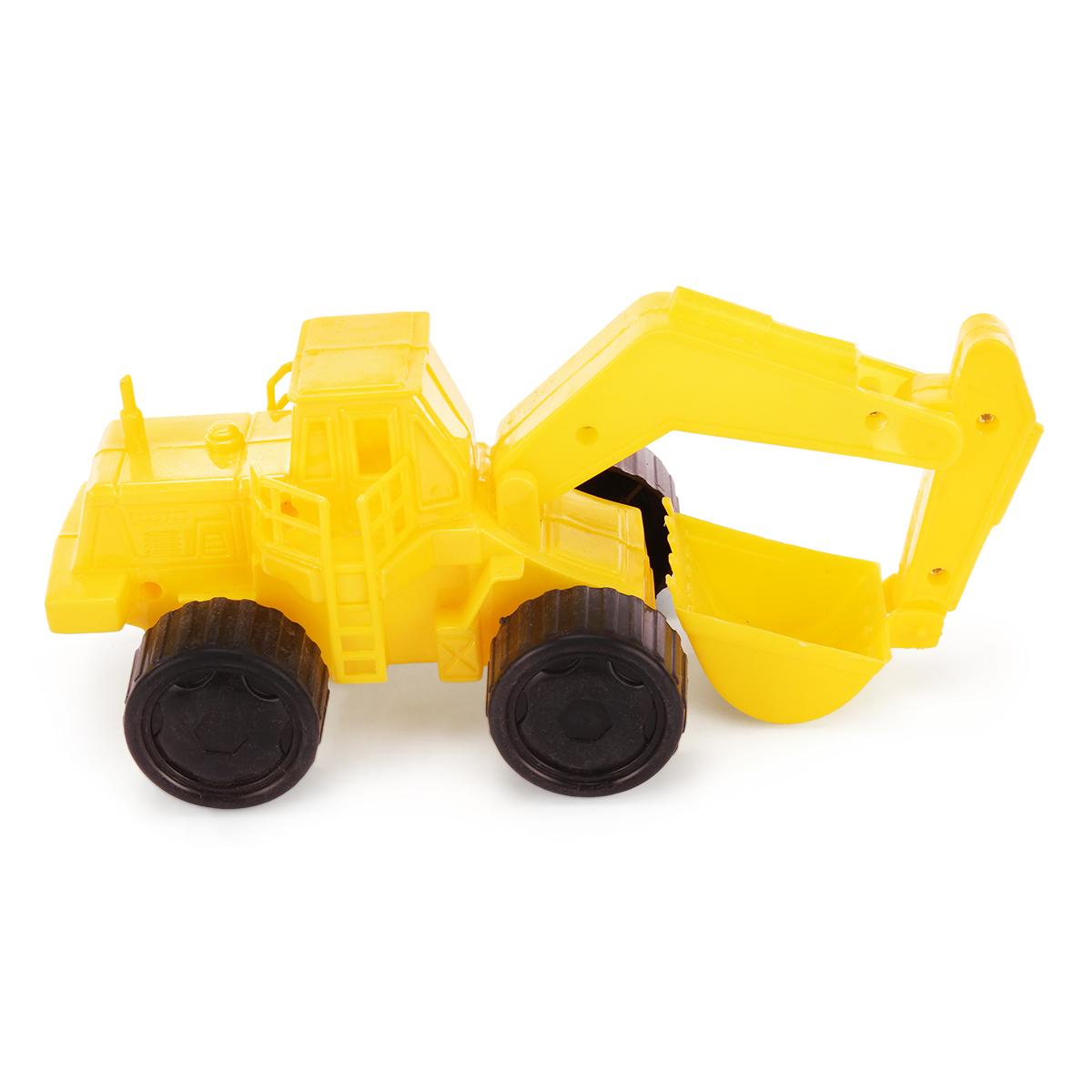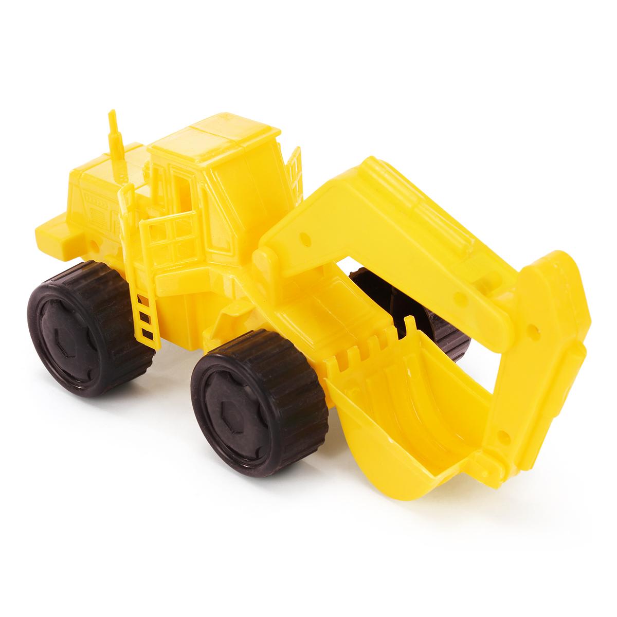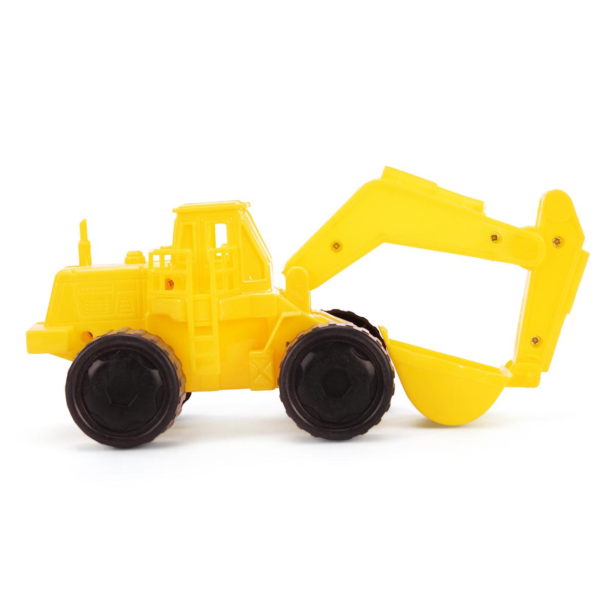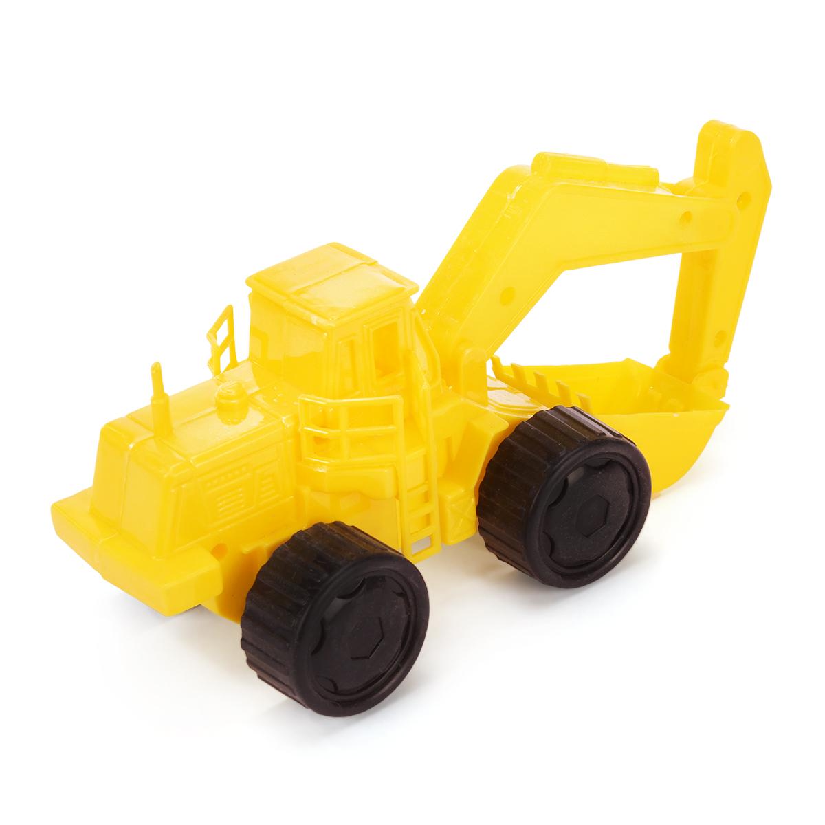 Экскаватор выполнен в ярко-желтом цвете с черными колесами, что делает его заметным и привлекательным. Он имеет детализированную конструкцию, включая кабину и рабочие механизмы, что добавляет реалистичности в игру. Игрушка не содержит мелких деталей, что делает ее безопасной для детей. Пластиковый материал легко чистится и сохраняет свой внешний вид даже после длительного использования.