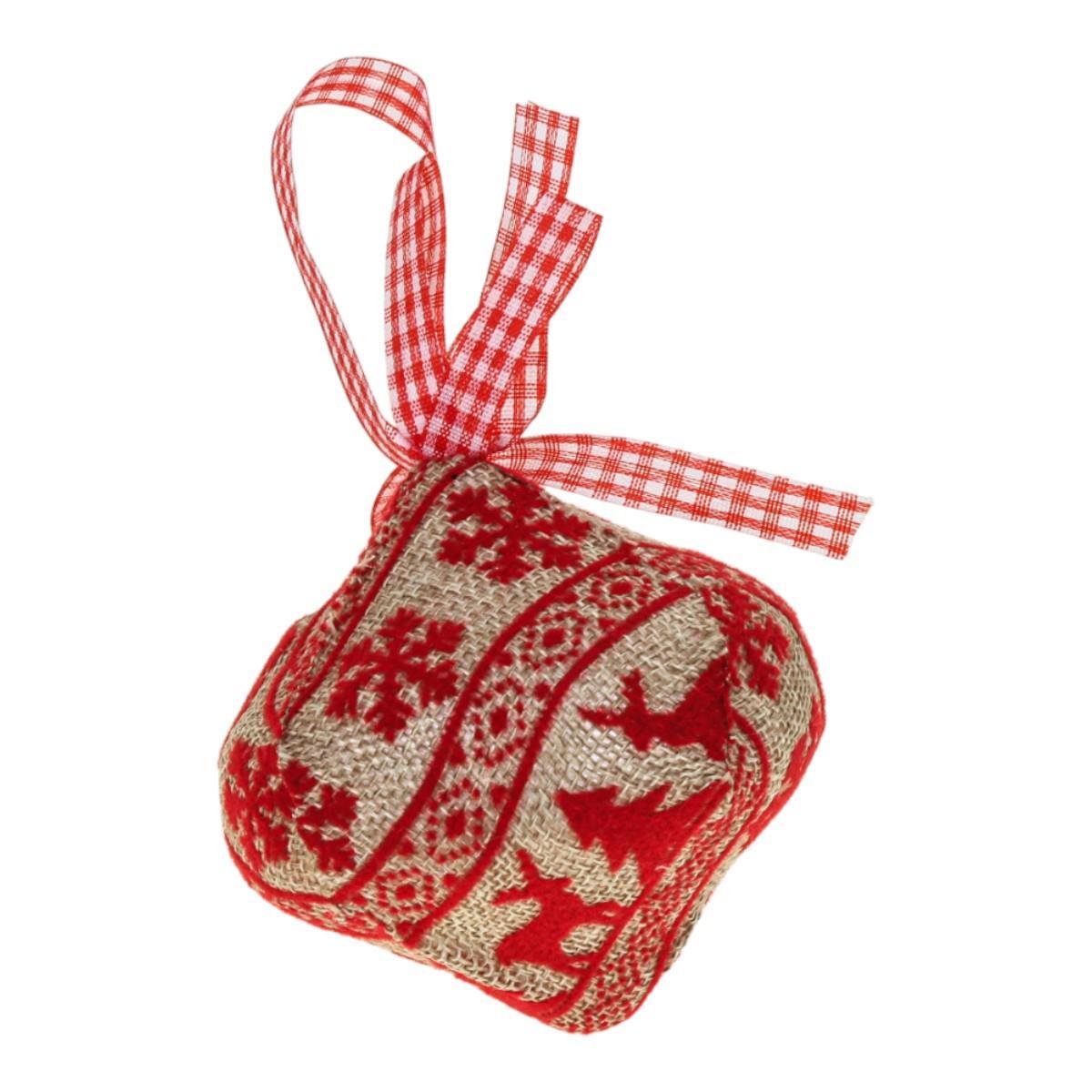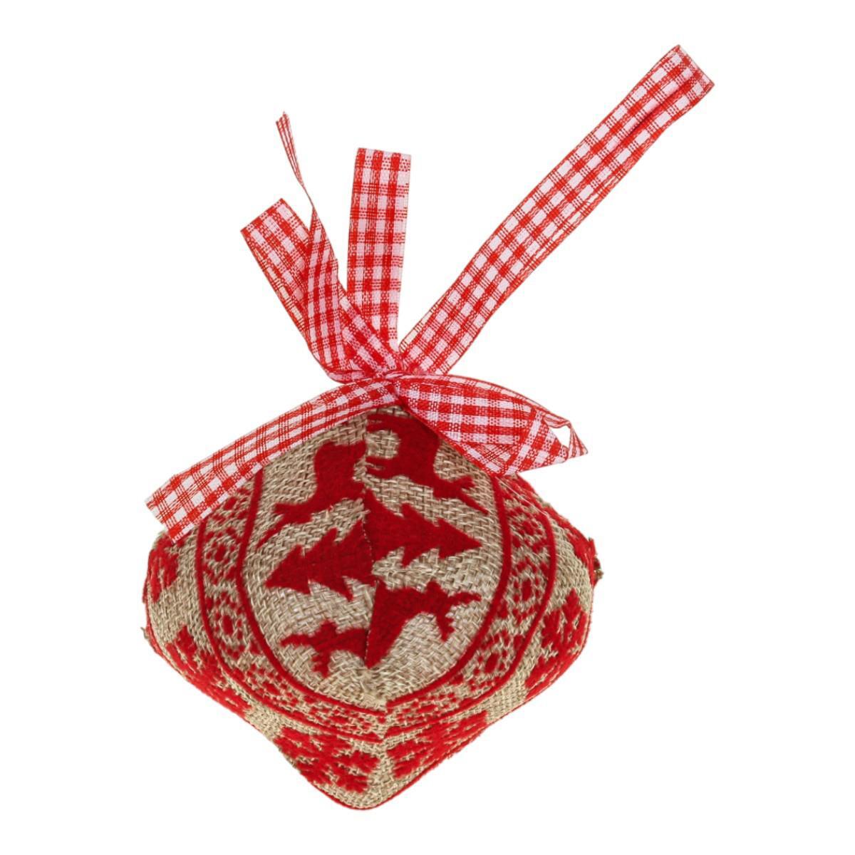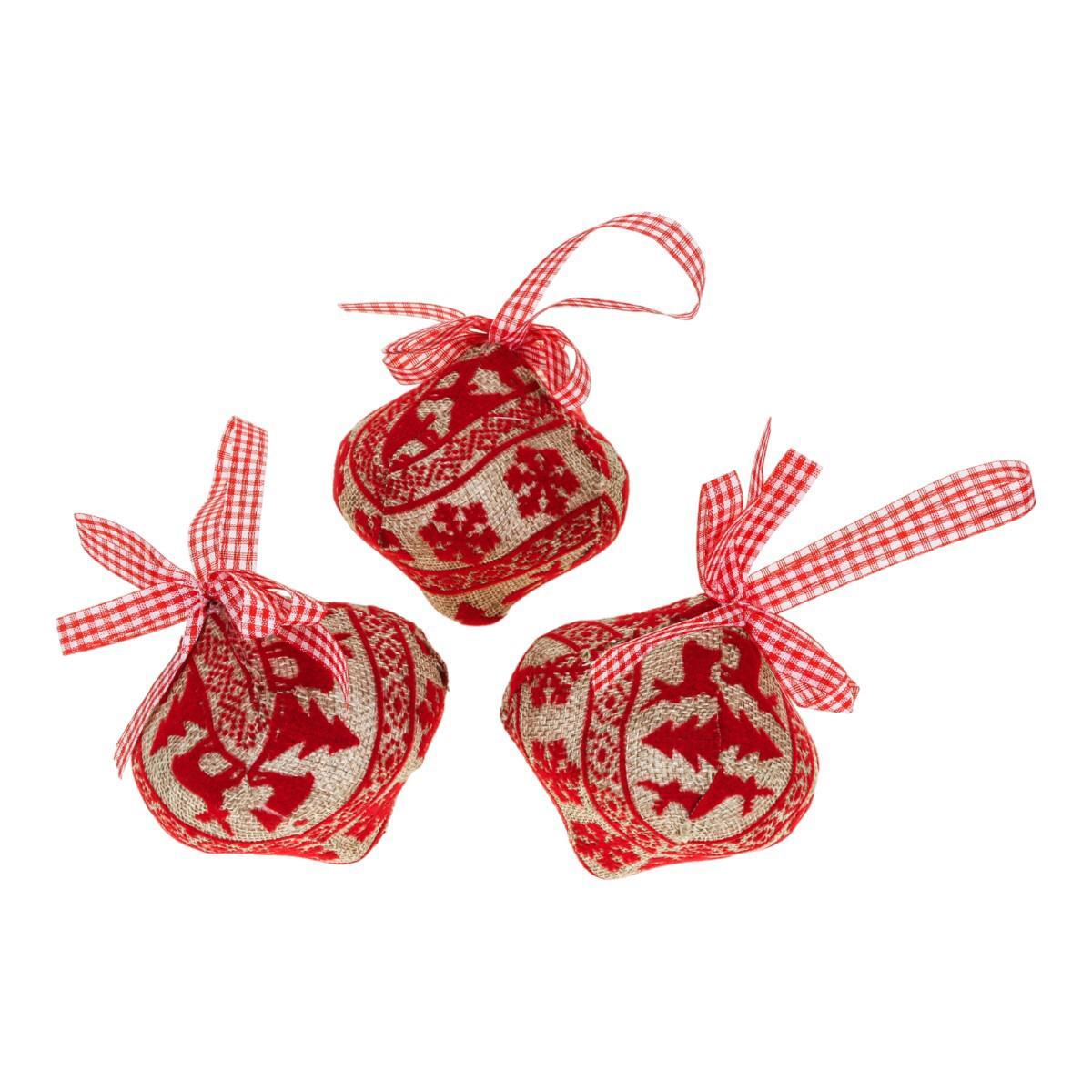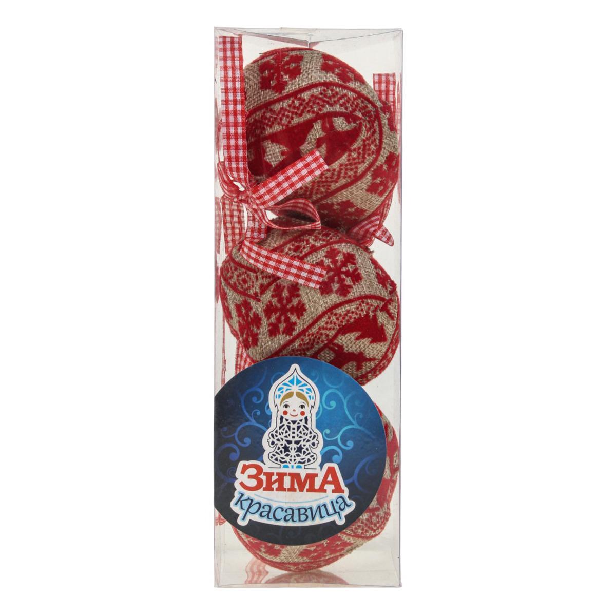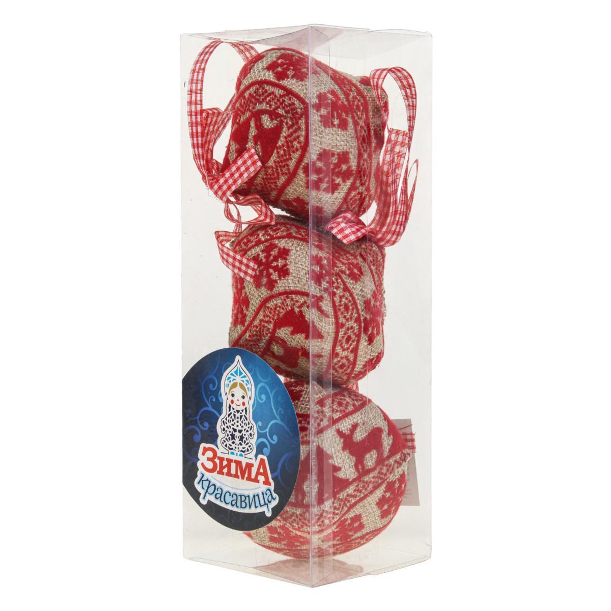 В набор входит три штуки, каждая диаметром 8 см, покрытая тканью с красным узором и оснащена прочной текстильной лентой для подвешивания. Коробка прозрачная, что позволяет сразу увидеть содержимое.
