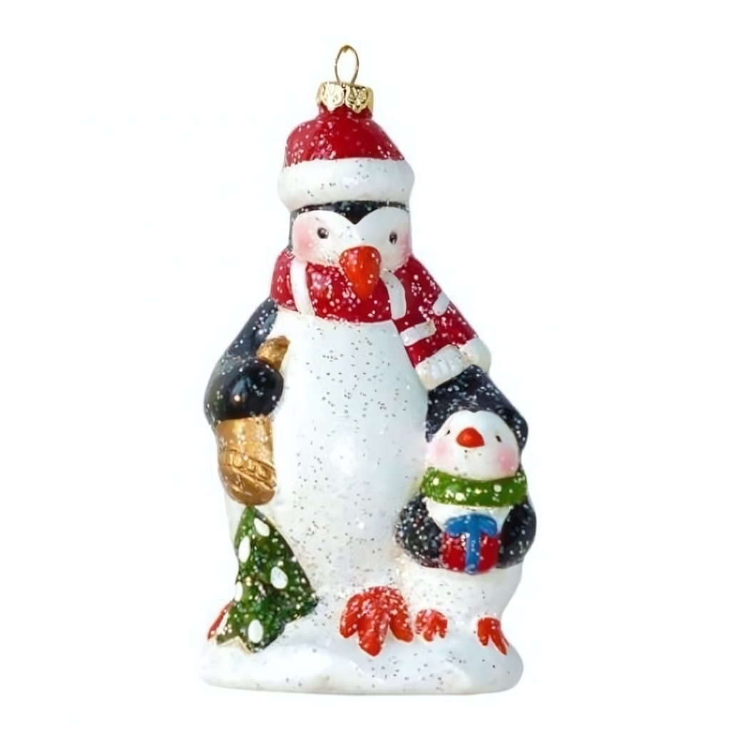 Высота фигурки — 13,2 см. Изготовлена из прочного пластика (ПВХ). Основные цвета: белый фон с чёрными деталями, красные акценты (шапочка, шарф) и зелёный элемент на ребёнке‑пингвинёнке. На поверхности нанесены мелкие блестки, усиливающие новогодний блеск.