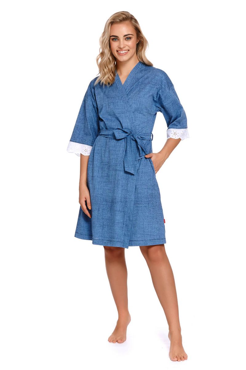 Халат представлен в синем цвете, который сочетает в себе спокойствие и элегантность. Этот оттенок легко комбинируется с другой домашней одеждой и создает гармоничный образ. Изделие соответствует размеру L, что обеспечивает комфортную посадку для соответствующего типа фигуры.