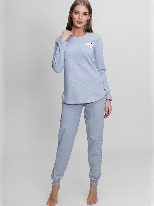 Комплект состоит из двух предметов: длиннорукавного свитшота с округлым вырезом горловины и брюк свободного покроя. Свитшот выполнен из ткани двух расцветок — рукава и передняя часть однотонные, спинка украшена горизонтальными полосками. По бокам брюк проходит декоративная отделка в виде полосатого канта, которая добавляет комплекту стильности. Материал — приятный на ощупь трикотаж из байки, который сохраняет тепло и обеспечивает комфорт при длительной носке.