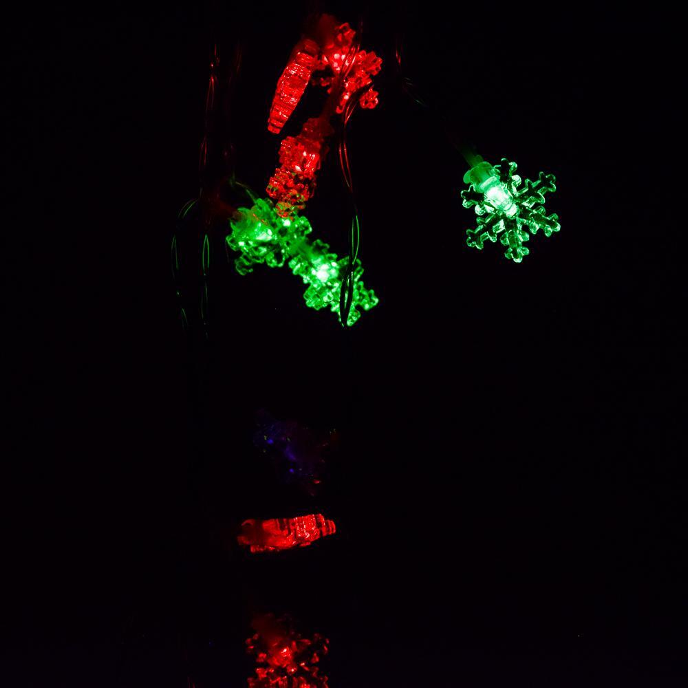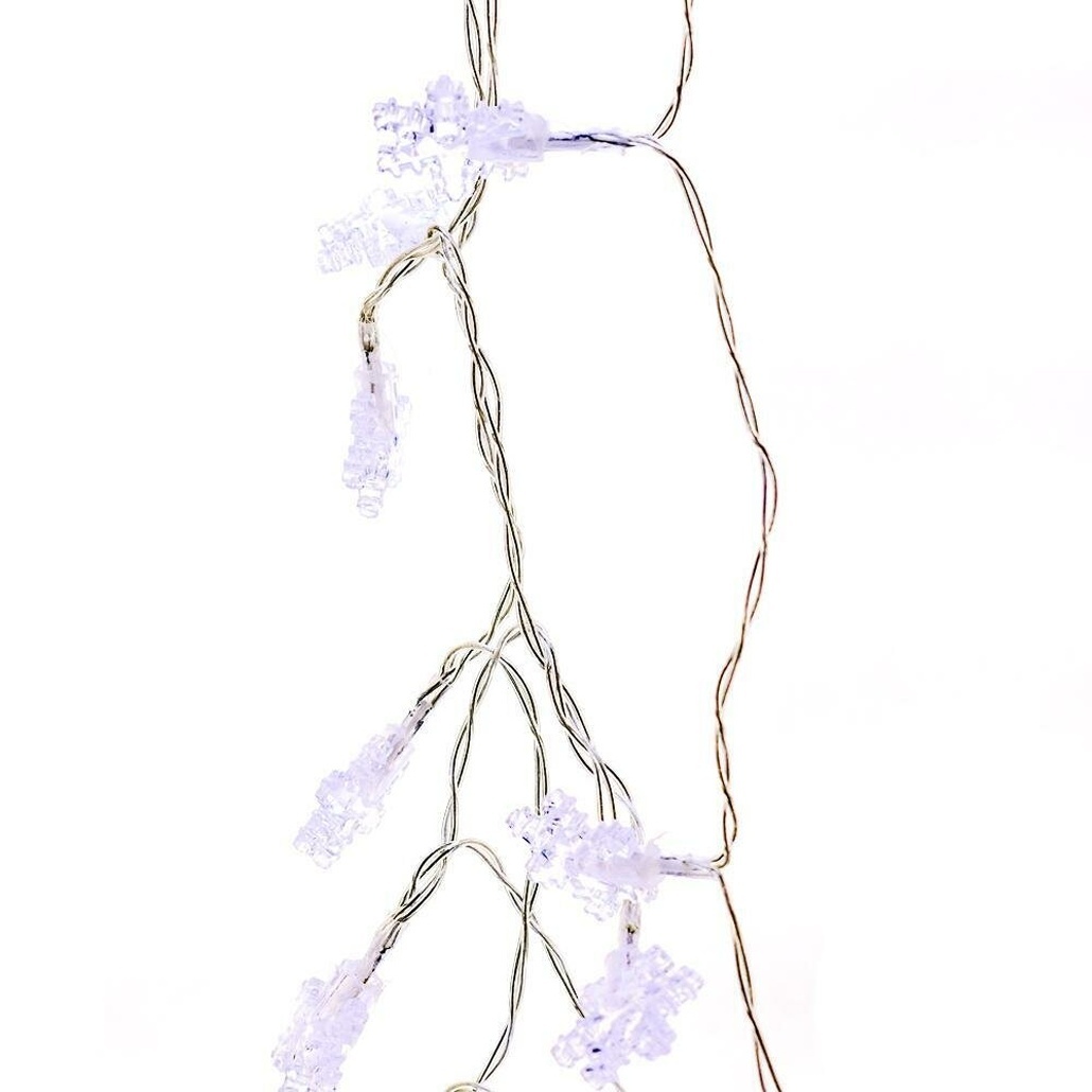 Гирлянда имеет длину 4 метра, на ней расположено 28 лампочек с насадками в виде снежинок. Насадки размером около 6 см выполнены из пластика и металла, что обеспечивает их долговечность. Гирлянда работает от сети, что делает ее удобной для любого празднования.