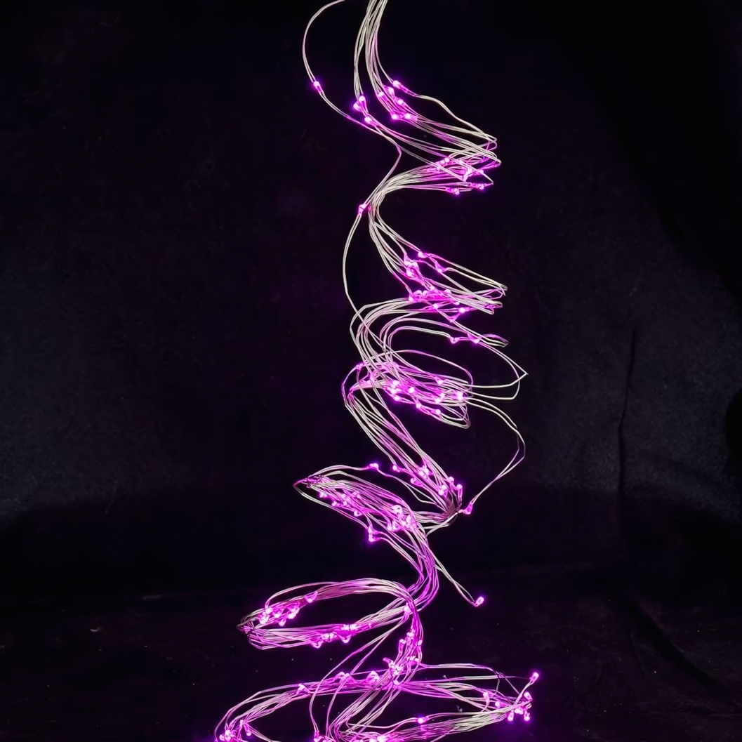 Розовая LED-гирлянда с 200 лампочками создаёт атмосферу тепла и праздника без мерцания. Гибкая металлическая проволока в пластиковой оплётке позволяет формировать изящные волны и спирали для оформления стен, оконных рам или мебели.