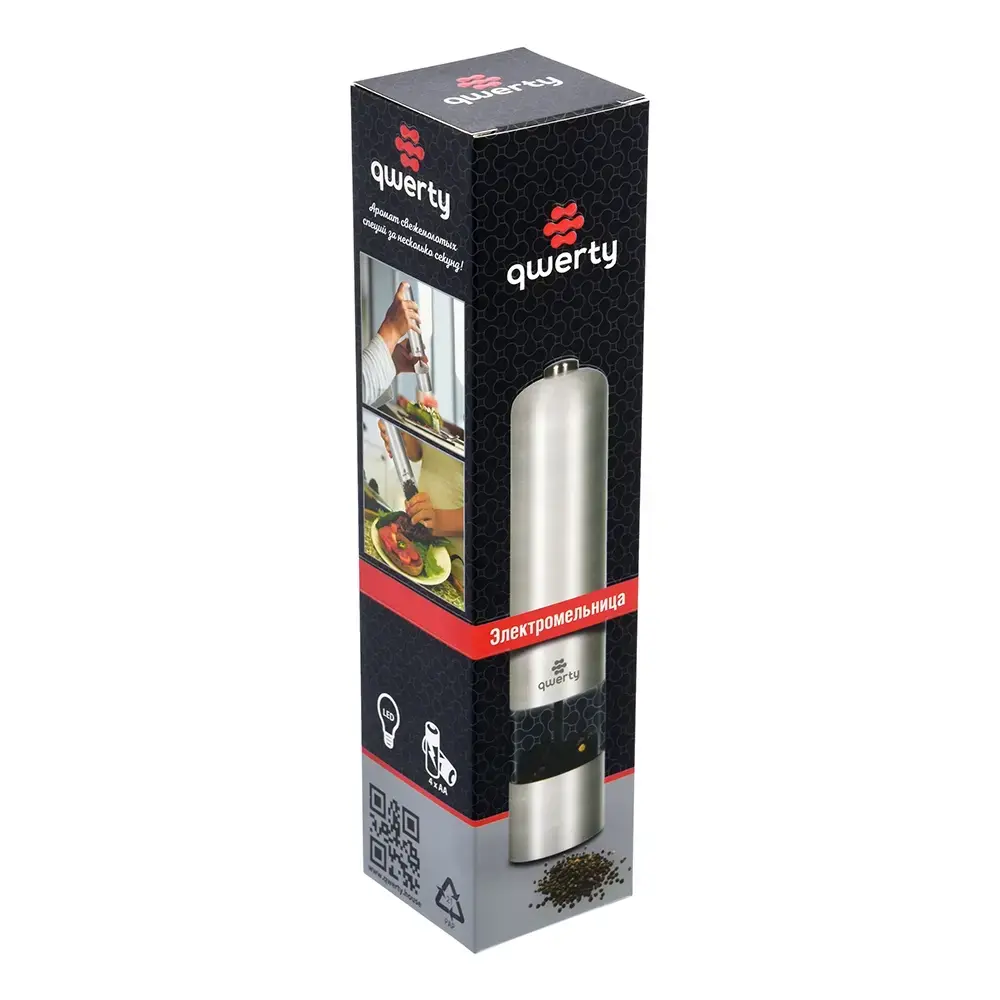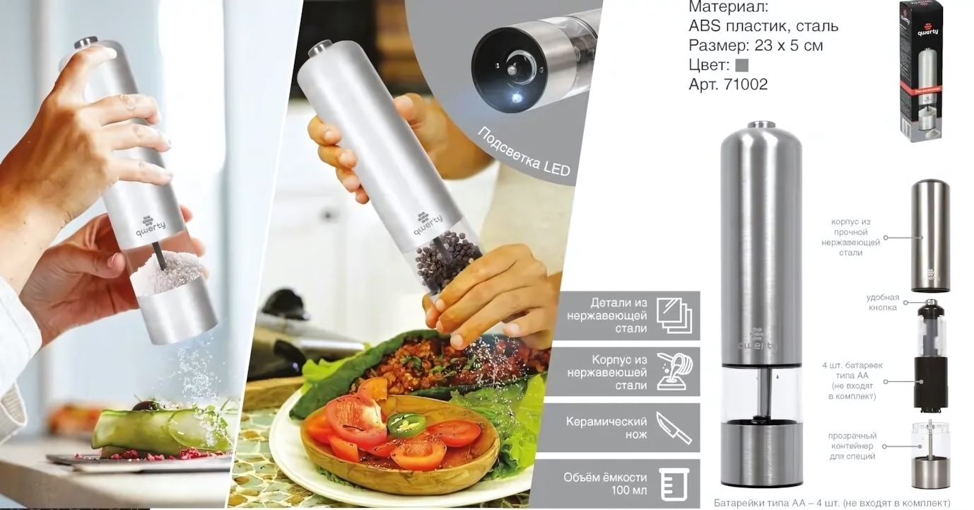 Размеры: 23x5 см, материал: металл и пластик, питание: 4 батарейки AA (не входят). Товар предназначен для комфортного использования в домашней кухне и профессиональной сфере, позволяя приготовить ароматные блюда быстро и удобно.