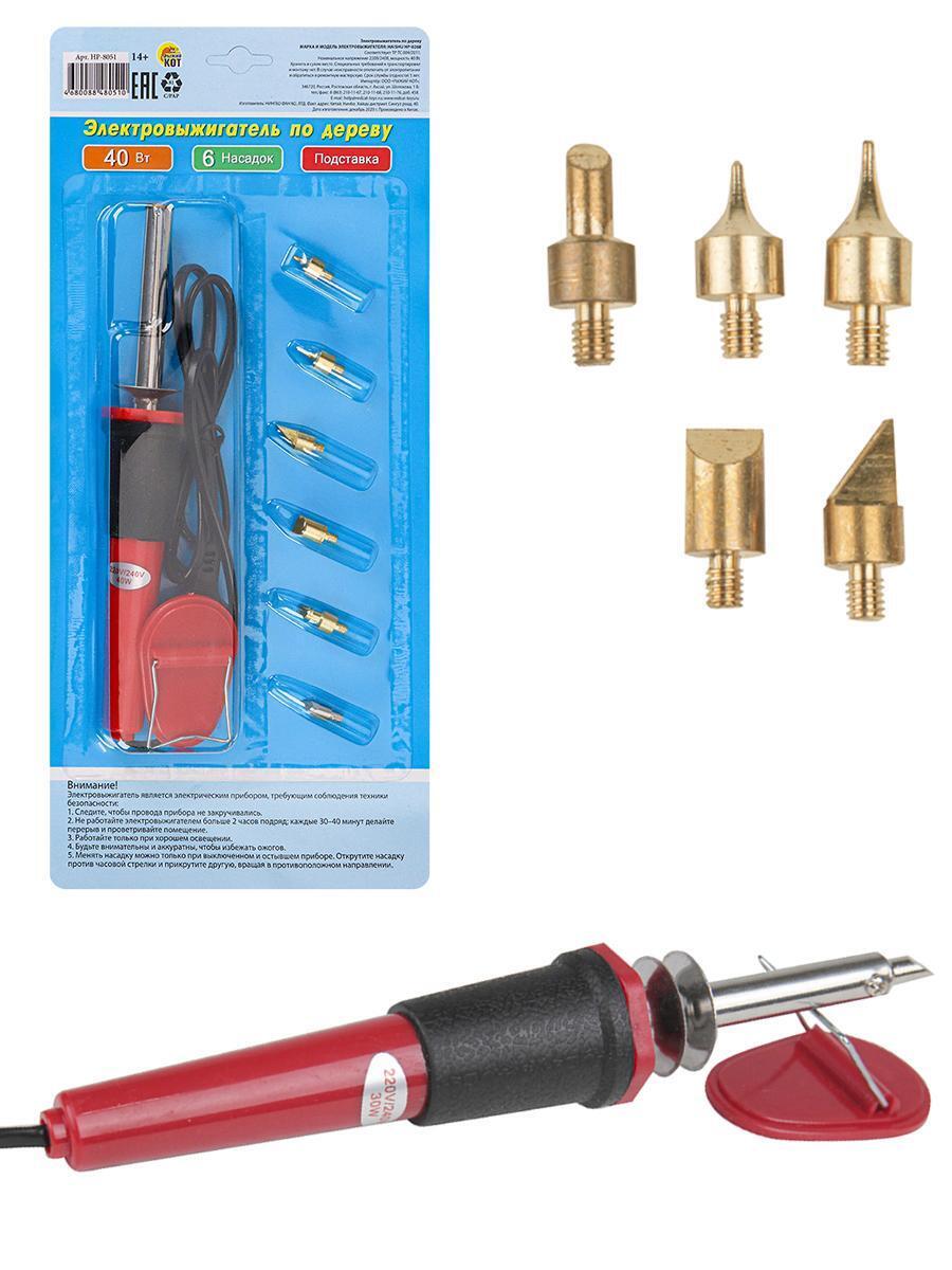 Функциональность: Электровыжигатель оснащен мощностью 40 Вт, эргономичной рукояткой и металлическим наконечником для точной работы. В комплект входит 6 сменных бронзовых насадок разнообразных форм, что позволяет создавать уникальные узоры, рисунки и рельефы на дереве, фанере, а также на бумаге и других материалах. Устройство удобно держать в руке, а металлическая подставка обеспечивает безопасное хранение и использование.