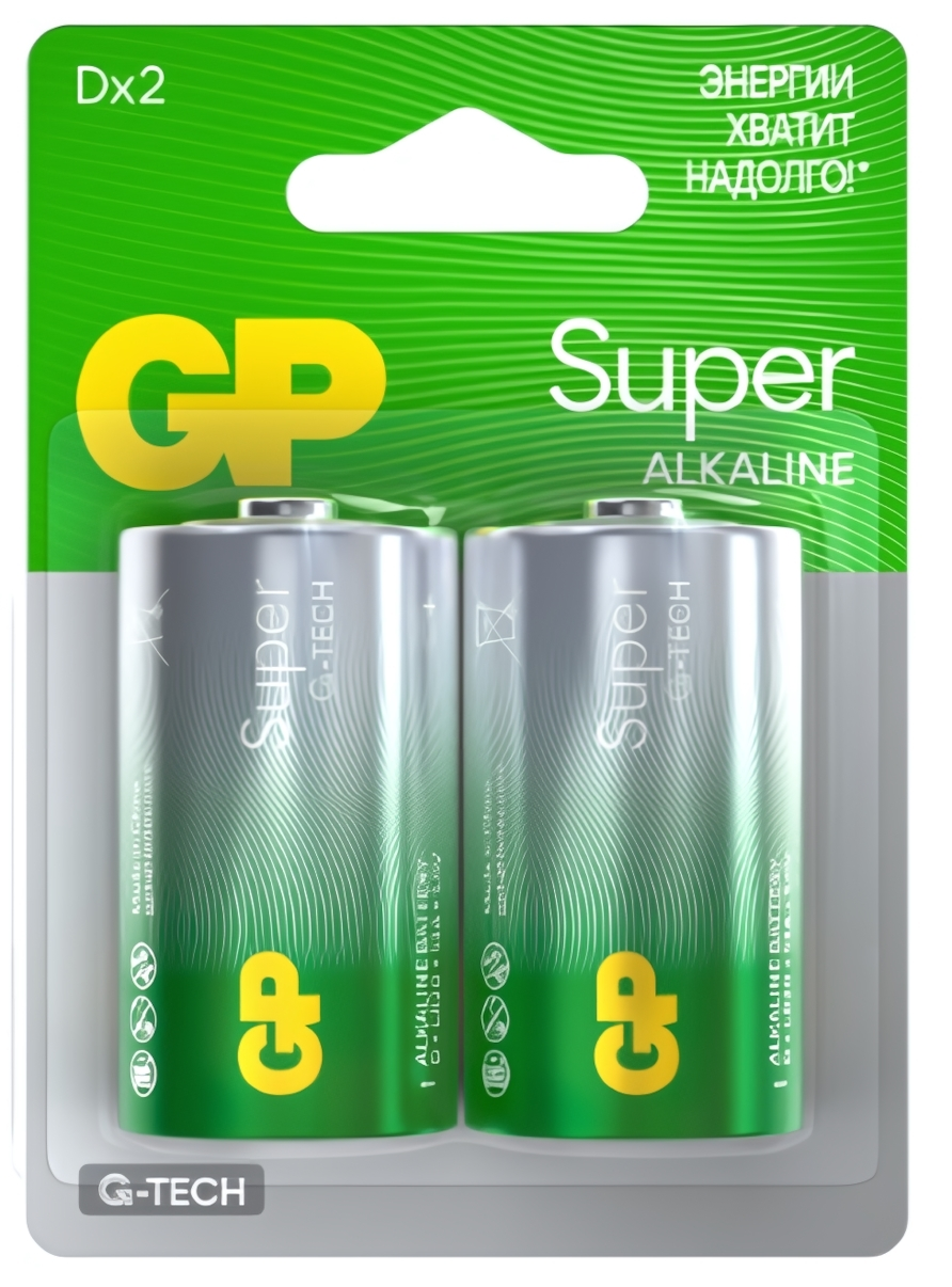 Батарейки алкалиновые GP LR20 'Super', 2шт, тип D, надежные для длительного использования
