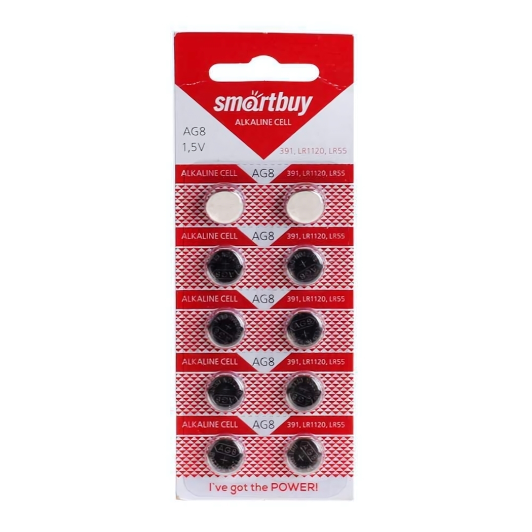 Элемент питания Smartbuy AG8 представлен в упаковке, которая включает две серебристые и шесть черных батареек. Каждая батарейка имеет круглую форму и маркировку "ALKALINE CELL", что подтверждает их высокое качество. Не упустите возможность обеспечить надежное питание для ваших устройств с элементами питания Smartbuy AG8!